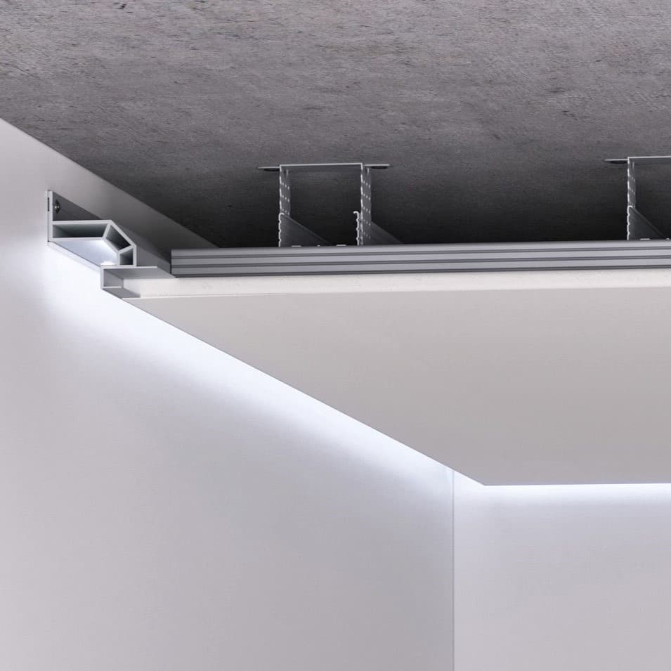 Гипсокартонные листы легко монтируются шурупами на каркас из металлических профилей. Это делает установку быстрой и относительно простой. После установки основу выравнивают, шпаклюют, красят. Это создает гладкую ровную поверхность без видимых швов и дефектов. Можно сделать теневой потолок из гипсокартона.