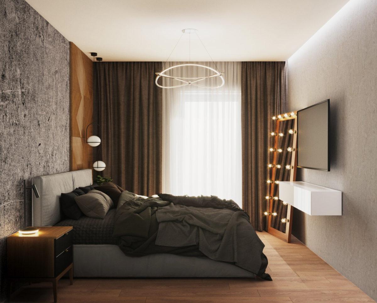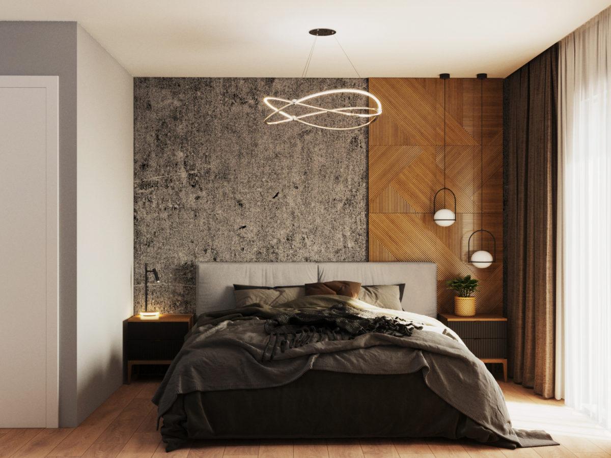 В спальне внимание притягивает стена позади кровати, которая отделана фреской, имитирующей грубый бетон и деревянными панелями.