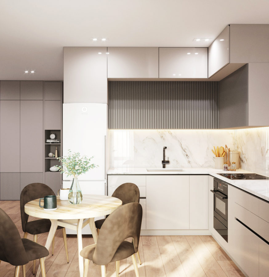 Кухня-гостиная выделяется эргономичным и функциональным пространством. Прямые линии кухонного гарнитура и столешницы, изготовленные из долговечных материалов, делают рабочую зону красивой и привлекательной.
