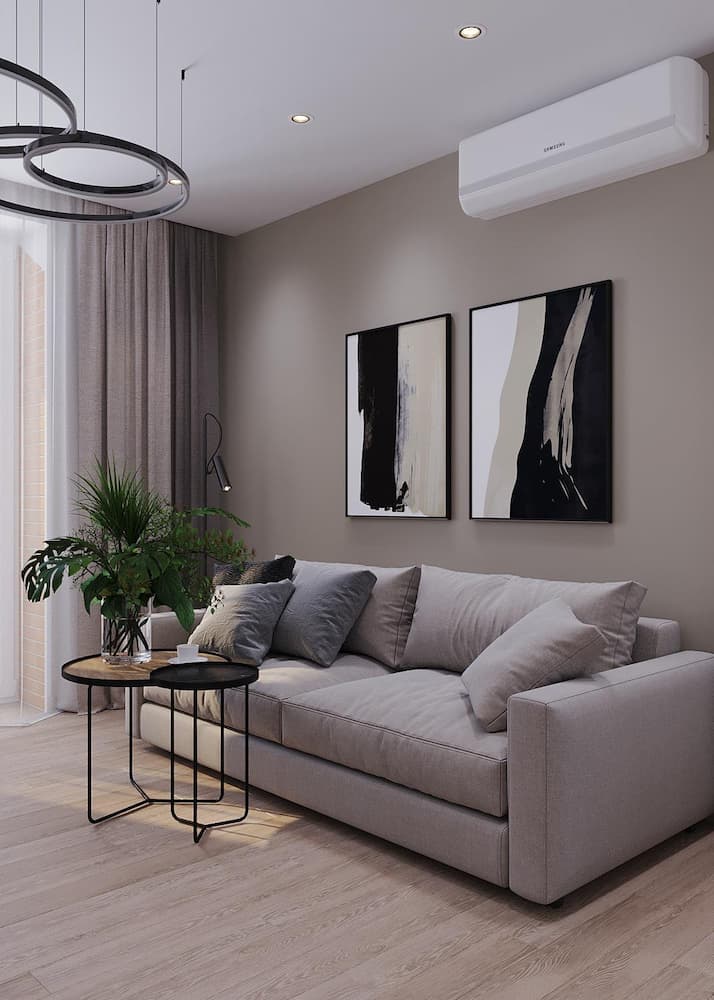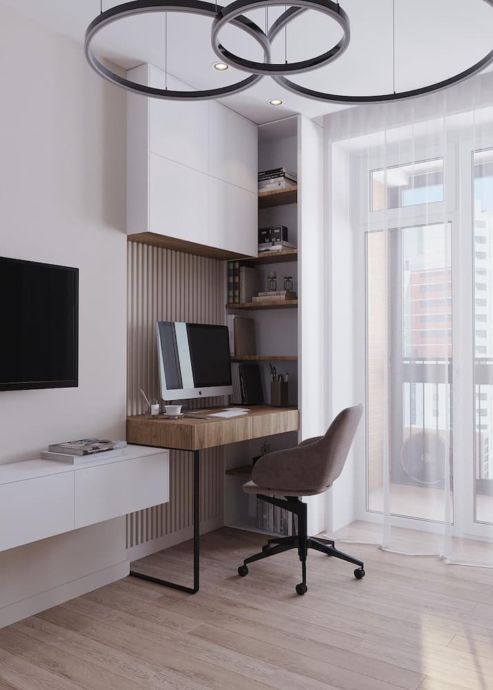 Основная комната квартиры по просьбе заказчика максимально функциональна. Здесь есть диван для отдыха и приема гостей, который также может служить основным спальным местом, помимо этого здесь расположен рабочий стол и ТВ-зона. Вместительный шкаф-купе позволяет хранить одежду и личные вещи, а зеркала на дверцах визуально расширяют пространство.