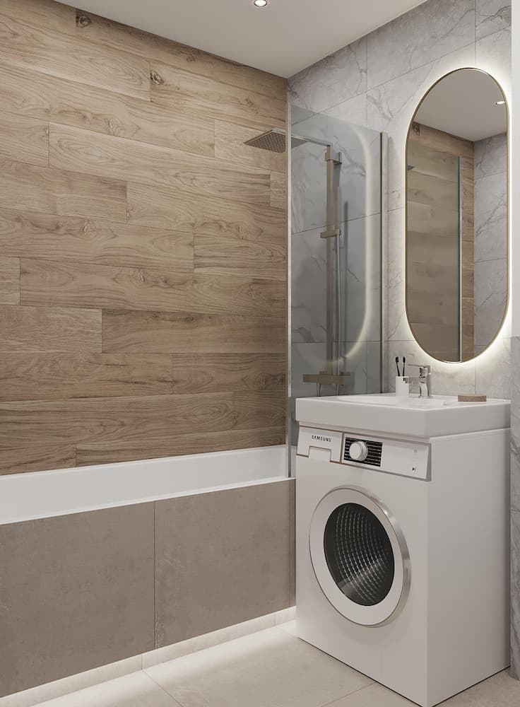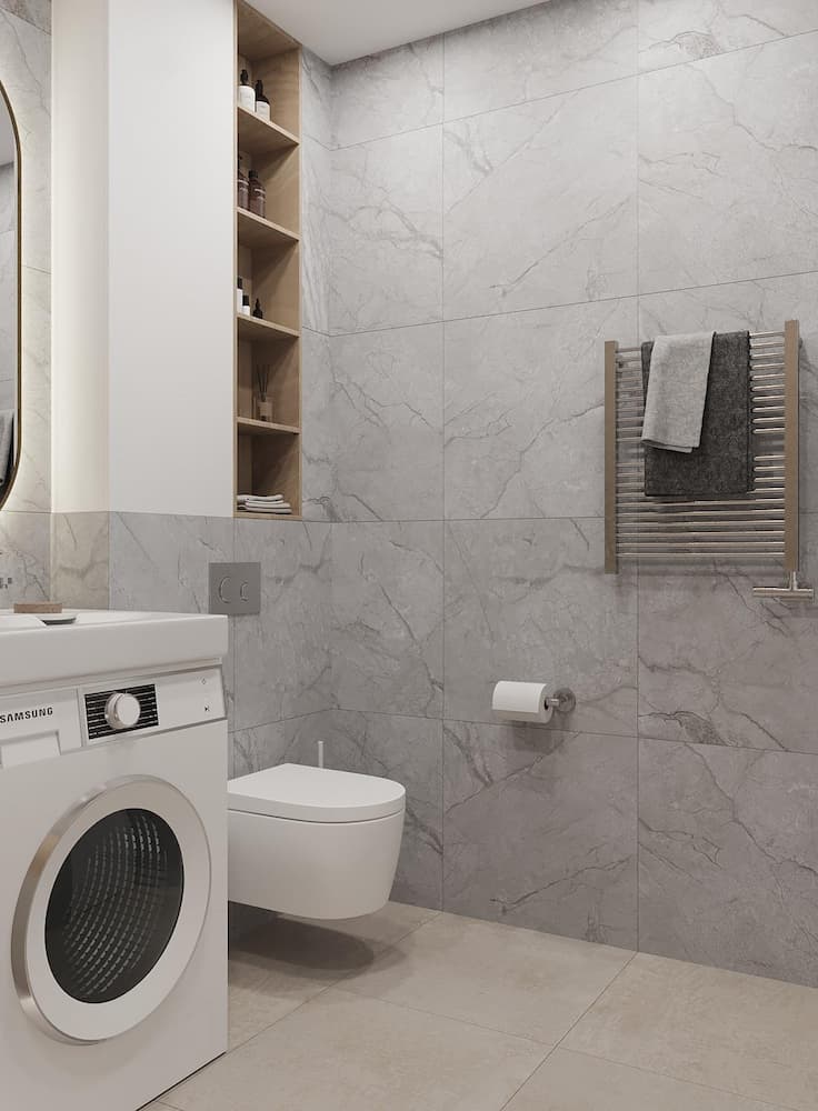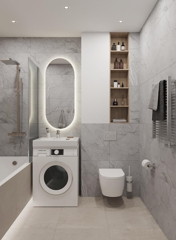 Ванная комната этой квартиры тоже не остается без внимания. Несмотря на небольшую площадь здесь умещено все необходимое. А выбор светлого керамогранита визуально расширяет пространство. Здесь использовано необычное дизайнерское решение для экономии места, а именно расположение раковины на стиральной машине.