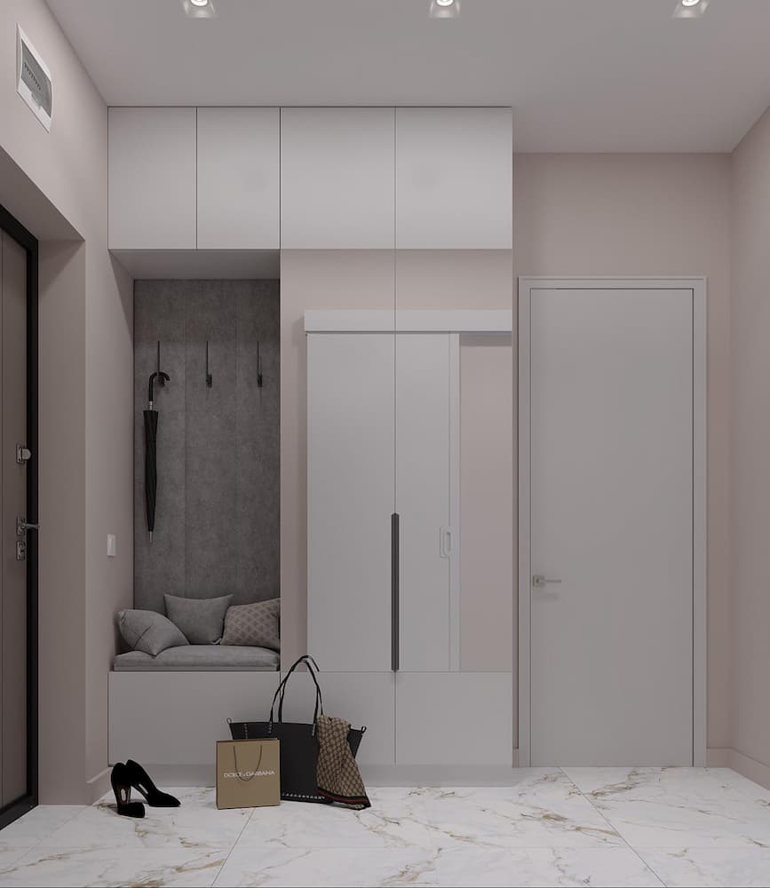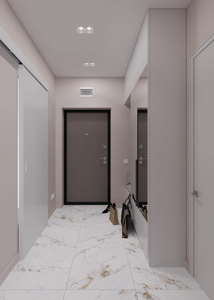 Дизайн-проект однокомнатной квартиры разработан нашим дизайнером для молодой девушки. При входе в квартиру нас встречает просторный светлый коридор. В прихожей расположен шкаф для одежды с зеркалом, что позволяет проверить свой образ перед выходом из дома.