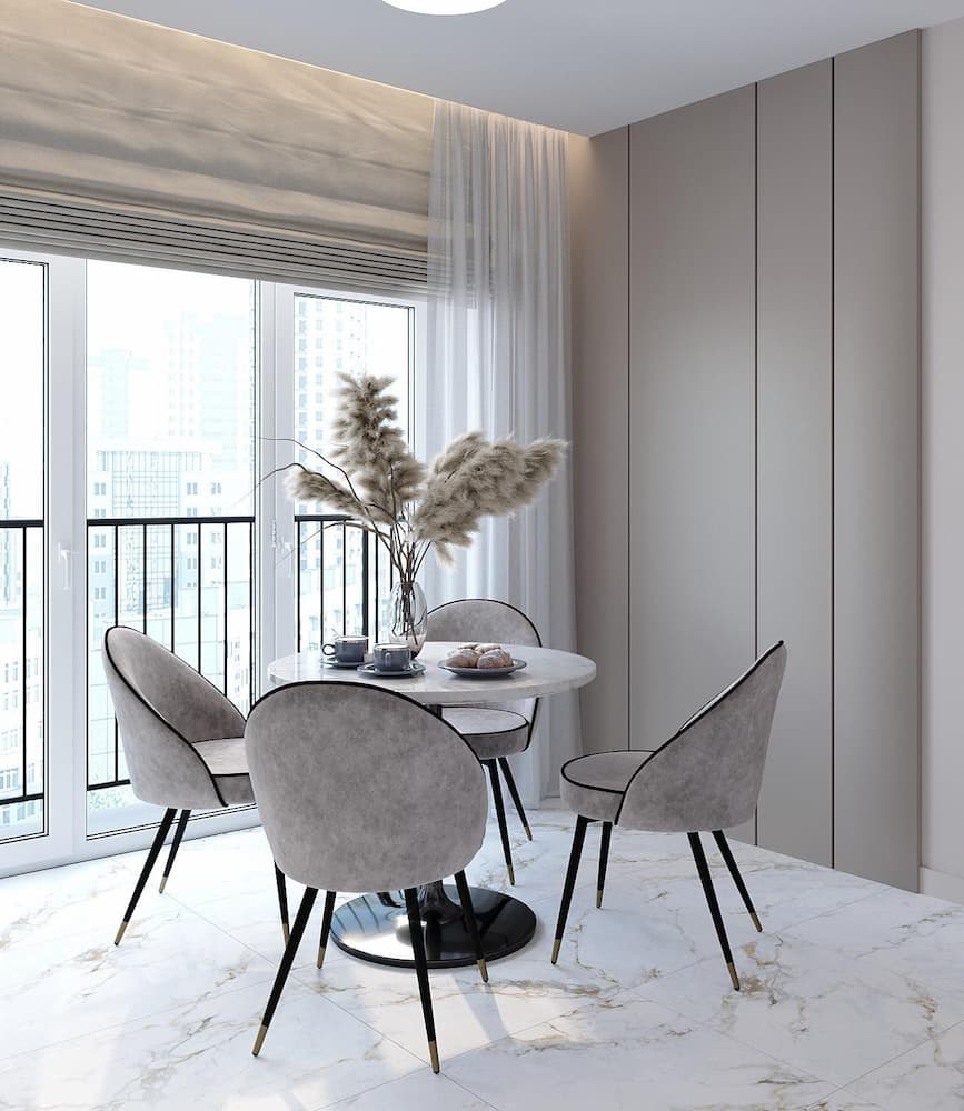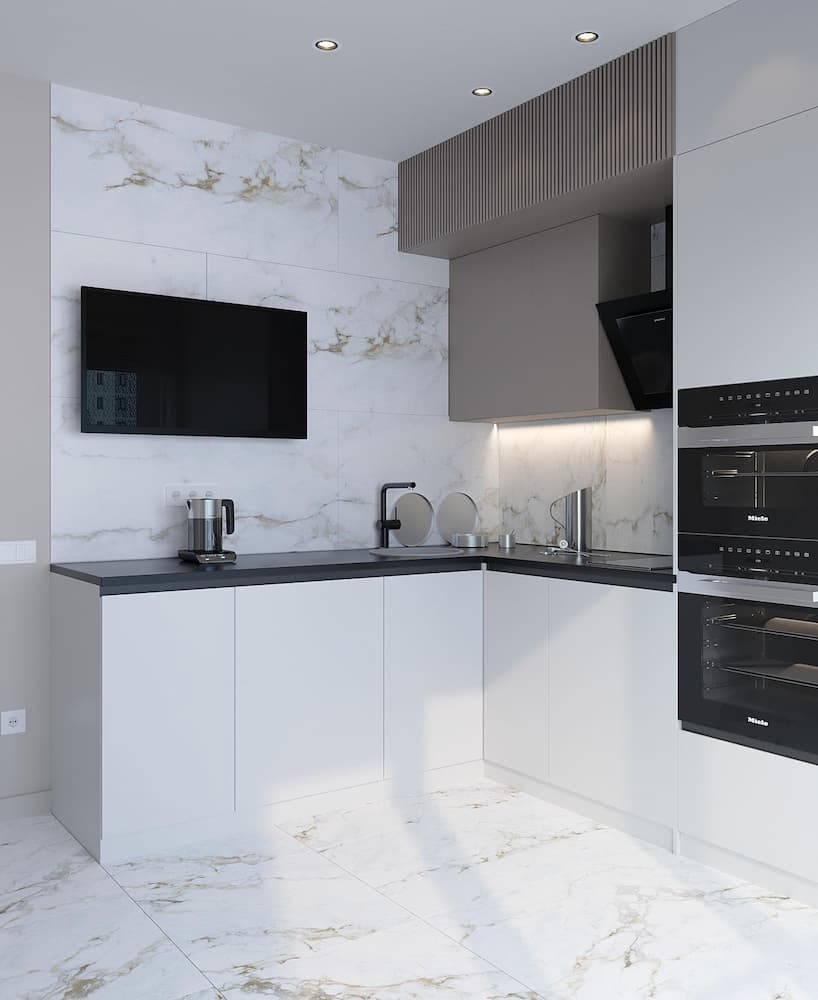 Кухня оснащена современной техникой для комфортной готовки и хранения продуктов. Кухня очень светлая за счет выбора светлого керамогранита для пола, кухонного фартука, а также кухонного гарнитура благородного молочного цвета.