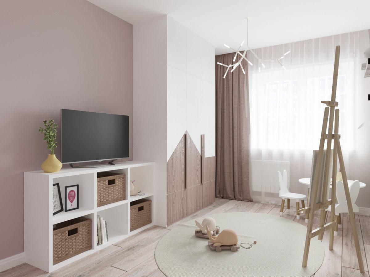 Детская комната для девочки олицетворение нежности и уюта. Интерьер выполнен в бледно-розовых и бежевых оттенках. Здесь есть место для отдыха и игр. Предусмотрены вместительные зоны для хранения вещей и игрушек.