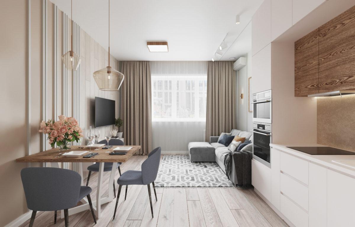 Кухня-гостиная светлое и просторное пространство. Для декора стены использовали декоративные рейки и пвх-плитку. Имеется несколько вариантов освещения. Комната многофункциональна и подойдет для приготовления и приема пищи, а также для совместного семейного отдыха и гостей.