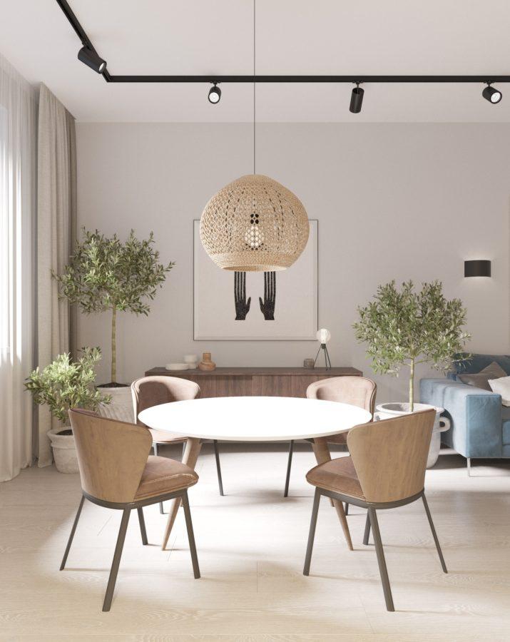 По проекту для ремонта используются только современные материалы и технологии. Дизайнерами созданы разные варианты освещения помещений. Так, например, в гостиной есть трековые светильники, люстра с плетеным абажуром над обеденной зоной, подвесные светильники над островом и бра над зоной готовки. В зависимости от потребностей, можно включать только некоторые из них. На полу кварцвиниловый ламинат — популярное сейчас покрытие, так как имеет наилучшее соотношение качества и износостойкости. Двери скрытого монтажа максимально незаметны и окрашены в цвет стен.