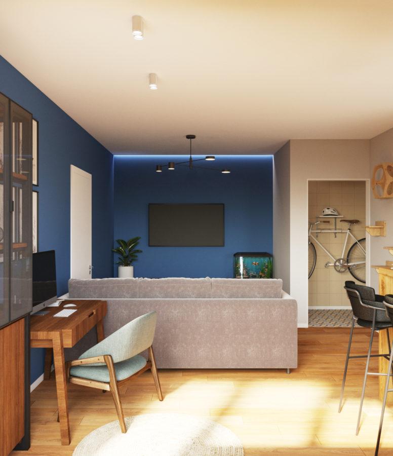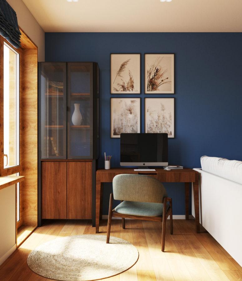Дизайн-проект двухкомнатной студии разработан для молодого человека. Дизайн уникальный и запоминающийся. В интерьере использовано много деревянных текстур. Примечательными являются также голубые стены в гостиной и спальне. Несмотря на яркость цвета, текстуры дерева смягчают его активность и создают гармоничное сочетание.