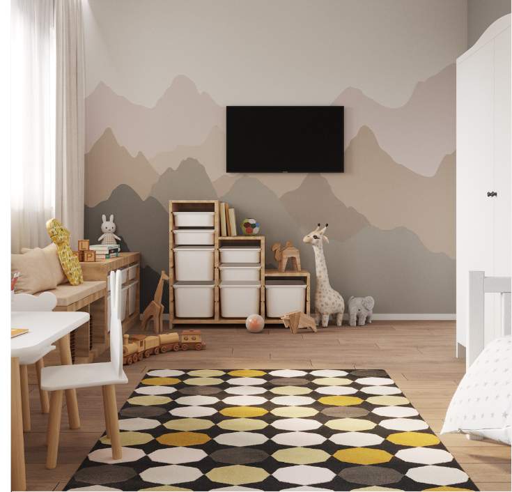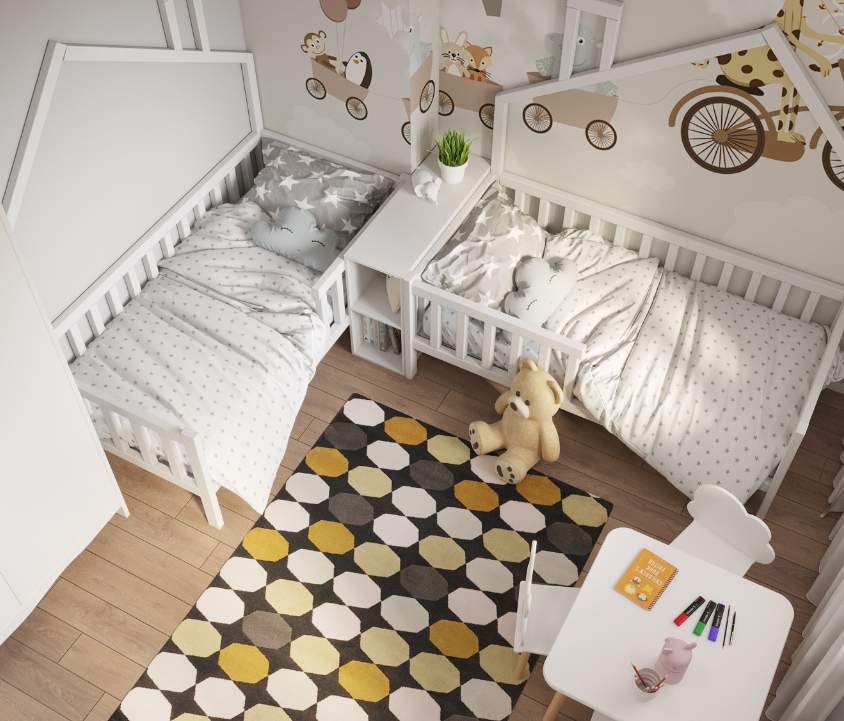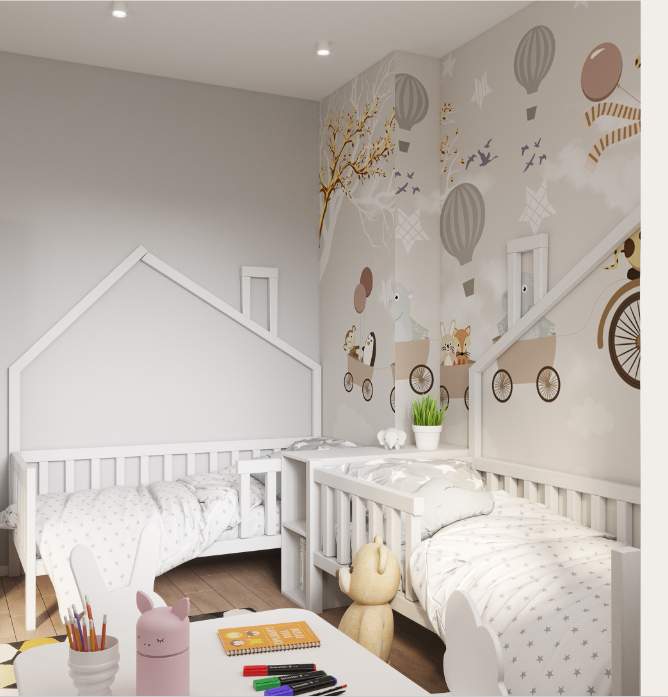 Детская комната в этой квартире спроектирована для двух маленьких детей. В ней создана игровая зона для игр и творчества, а также предусмотрено много места для хранения игрушек.