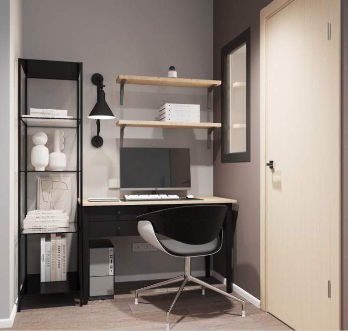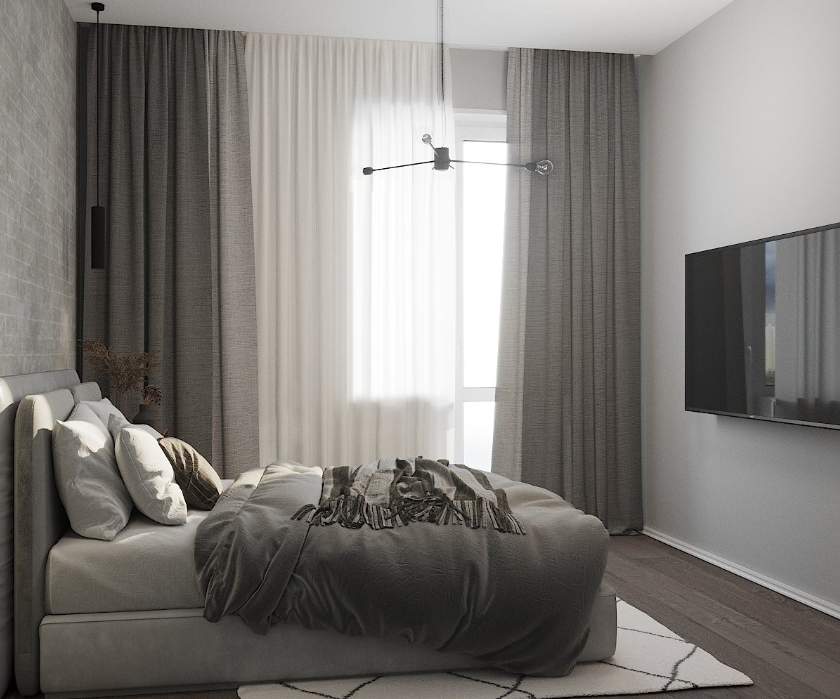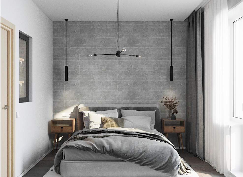 Холодный серый цвет разбавлен теплым деревянным полом и тумбами под дерево. В комнате расположены современные минималистичные светильники черного цвета.