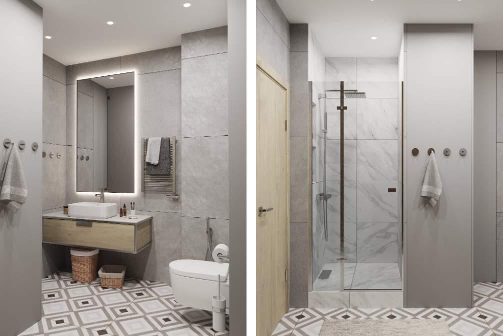 Для дизайна в ванной основным фоном выбрали нейтральный светлый-серый керамогранит под камень. Шкафы под стиральную машинку, бытовую химию и шкаф над инсталляцией сделали также светлым серым фоновым цветом, чтобы пространство не казалось, что перегружено мебелью.
