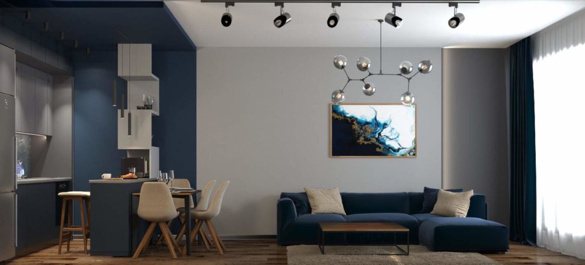 Нашей командой был разработан дизайн-проект для двухкомнатной квартиры площадью 85 кв.м. Главной особенностью интерьера является использование контрастных цветов: молочного и глубок синего.