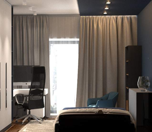 В спальне дизайн придерживается тех же принципов минимализма и функциональности. Здесь также оборудовано место для работы.