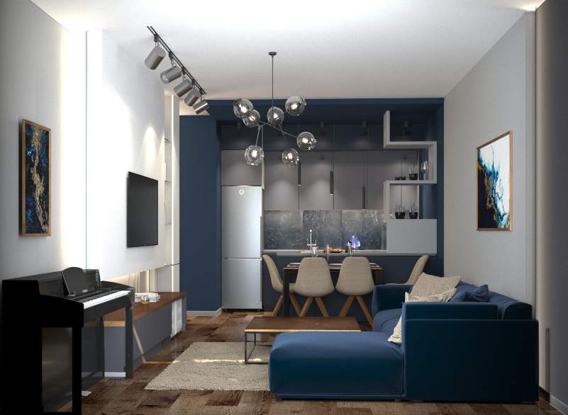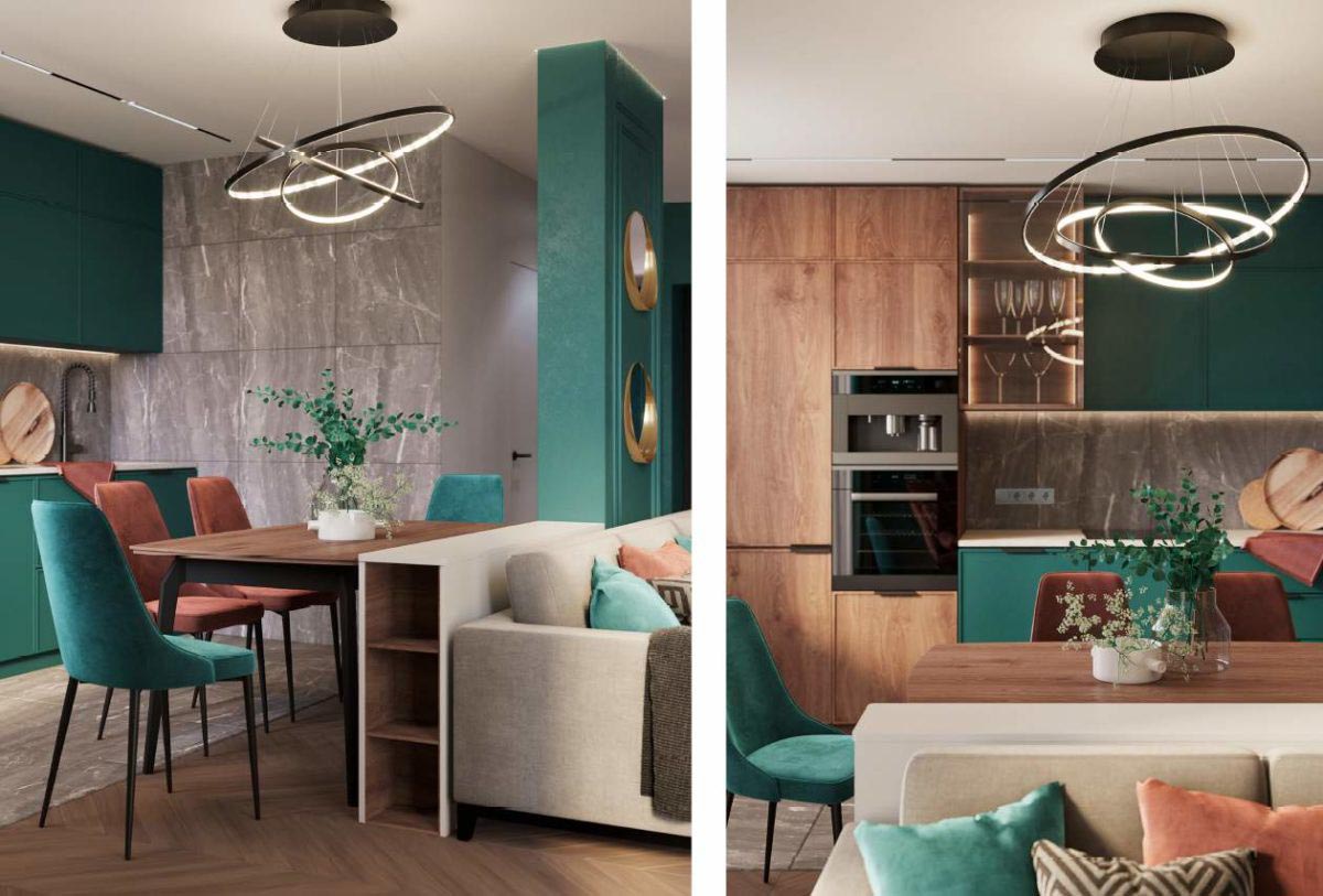 В гостиной разместился большой угловой диван, а также удобное кресло-качалка по желанию заказчиков. Они выразили пожелание о ярком зелено-изумрудном кухонном гарнитуре, поэтому одну из колонн окрасили в такой же цвет. Яркие акценты в виде насыщенного синего цвета также присутствуют в спальне. Таким образом получился стильный, современный и уютный интерьер для молодой семьи.