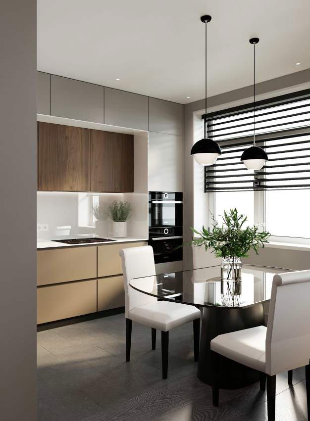 Дизайн-проект данной квартиры выполнен в современном стиле с элементами современной классики. Пол во всей квартире покрыт кварцвиниловым ламинатом, уложенным в форме «елочки». Чтобы выделить зону кухни использовали широкоформатный керамогранит.