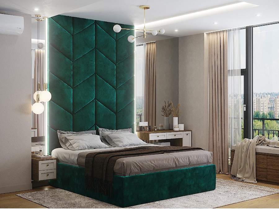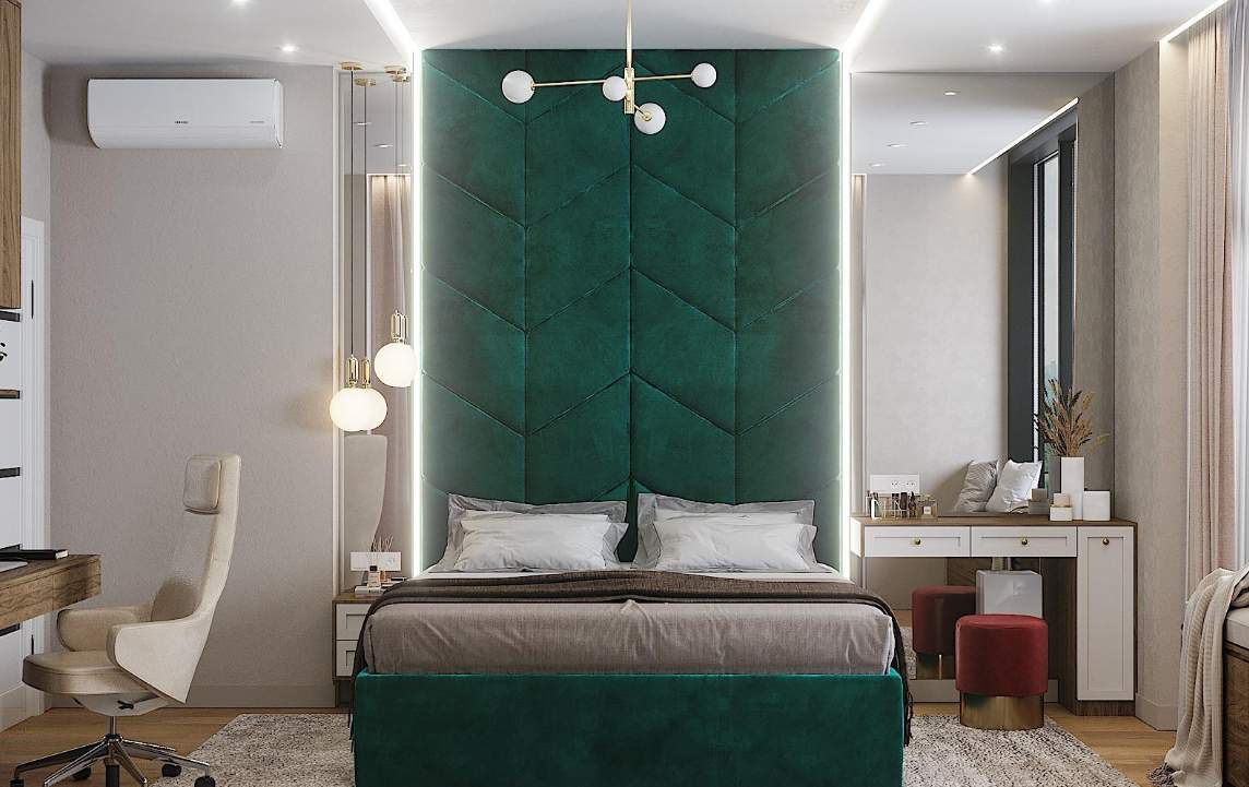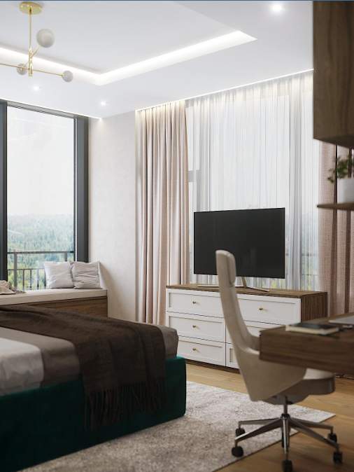 В спальне родителей царит атмосфера покоя: больашя удобная кровать с мягкими подушками, светлые шторы, защищающие от яркого света, и мягкий ковер на полу. Здесь же есть рабочее место и туалетный столик.