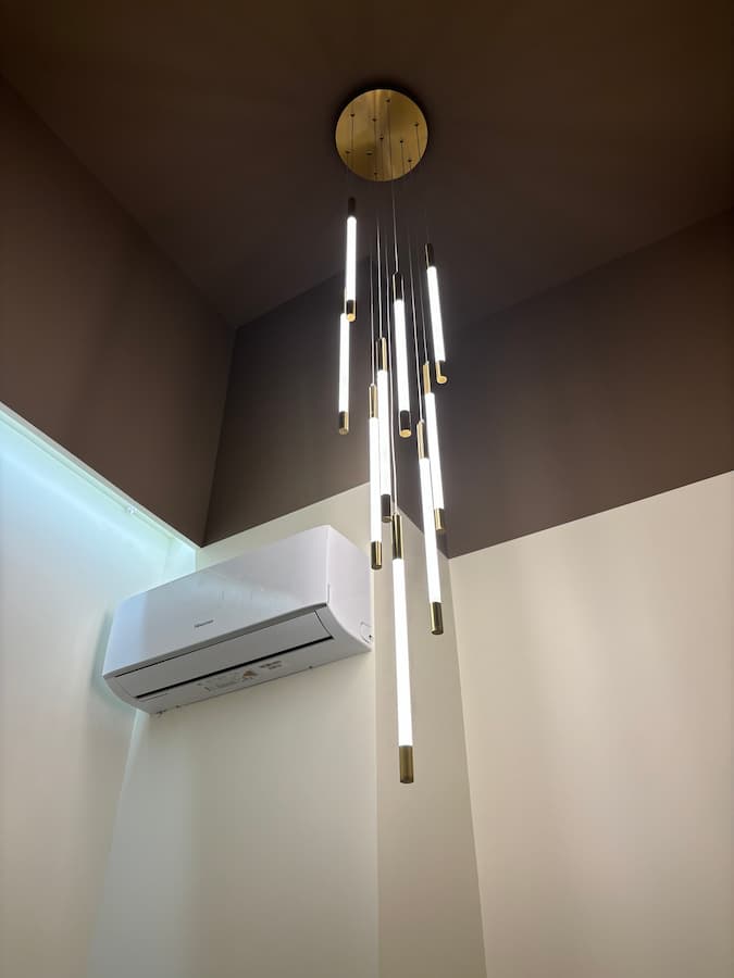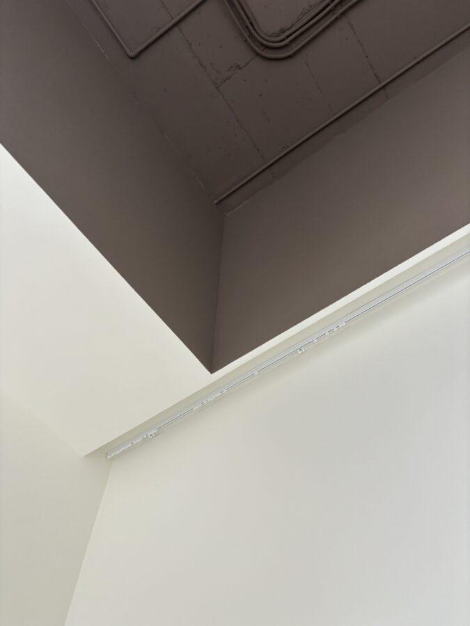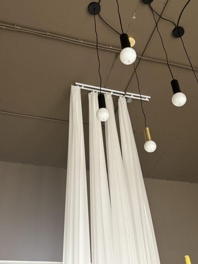 Потолок в салоне оформлен в стиле лофт с открытыми коммуникациями, что добавляет лёгкий индустриальный акцент. Лаконичные трековые светильники позволяют гибко управлять освещением: можно выделить определённые зоны или акцентировать внимание на новых коллекциях текстиля.
