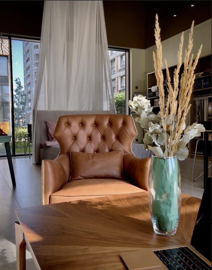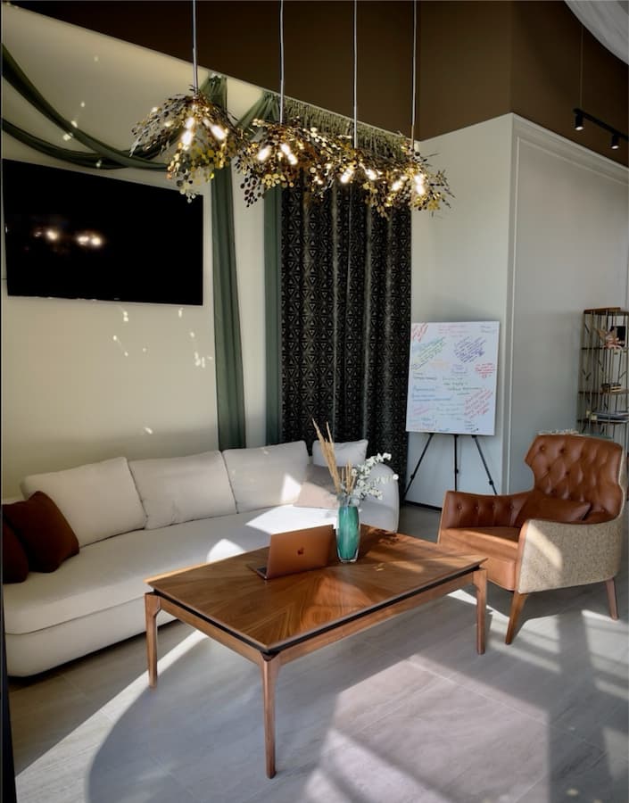 Этот салон стал идеальным сочетанием стиля, функциональности и изысканности, где каждый элемент интерьера был продуман до мелочей. Высокие потолки (5 метров) и панорамные окна делают пространство невероятно светлым и визуально просторным, приглашая посетителей насладиться атмосферой комфорта и уюта.