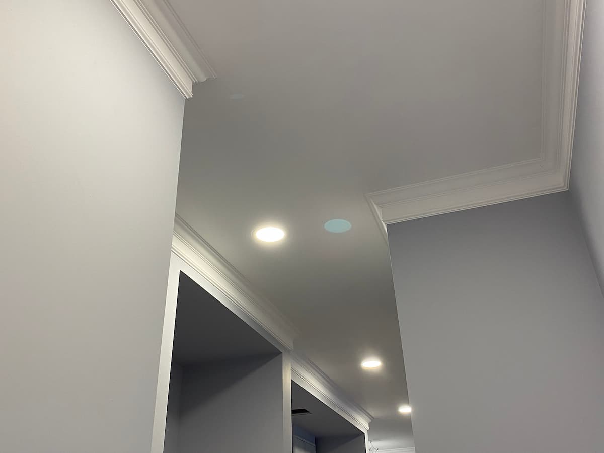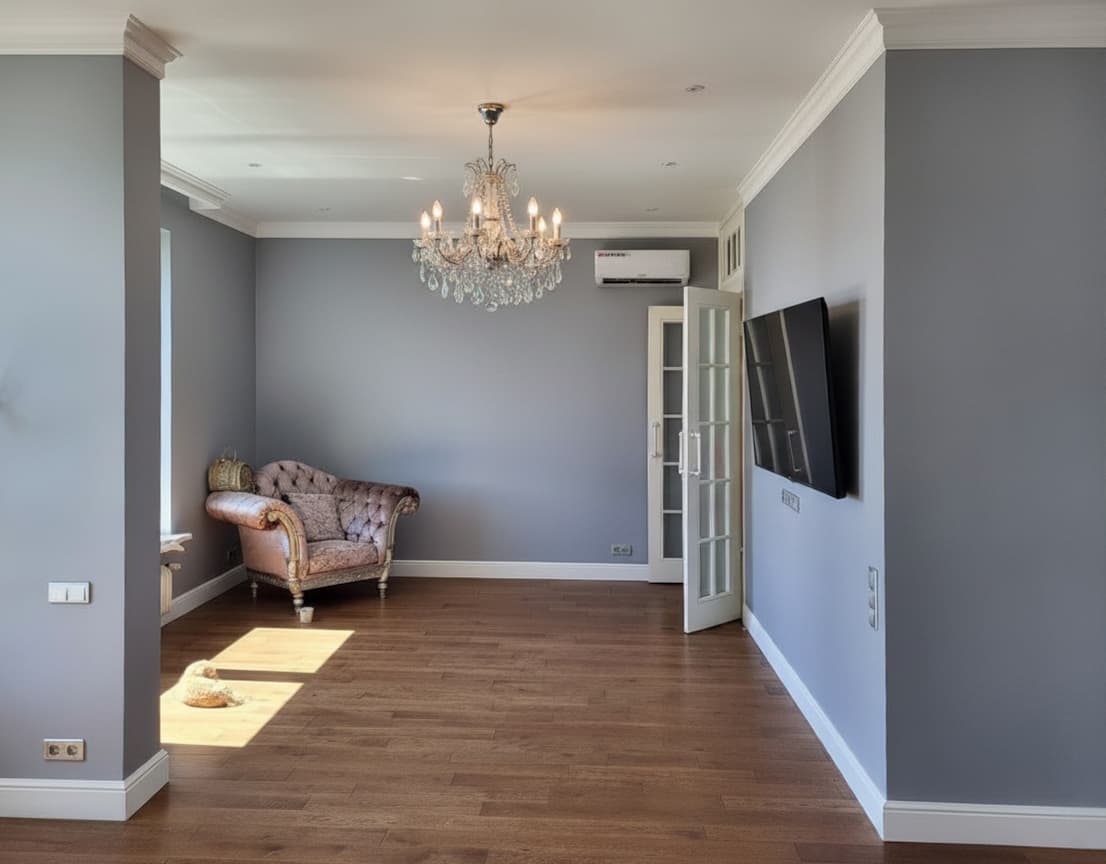 Основная отделка — акриловая краска Swiss Lake в спокойных светло-серых оттенках. Потолки украшены лепниной, классическими галтелями и плинтусами из дюрополимера, которые подчеркивают высоту помещений. На полу — инженерная доска, выложенная в хаотичном порядке из досок разной длины, благодаря чему пол выглядит живо и натурально.