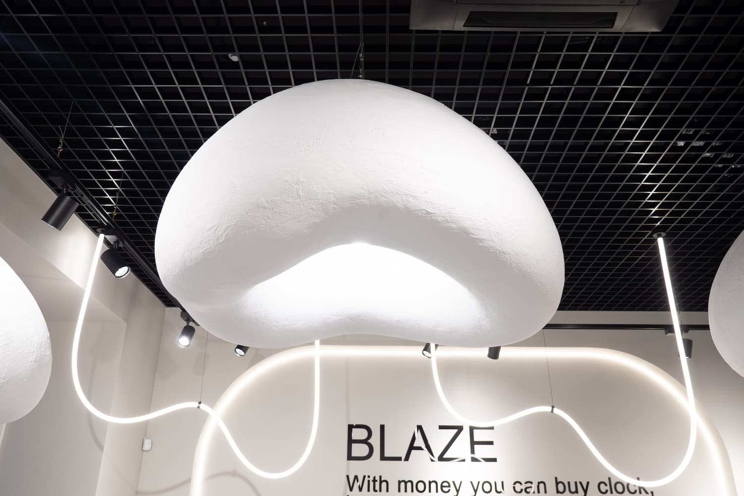 На потолке применили потолок грильято, который уместно вписывается в концепцию кофейни и сочетается с дизайнерским освещением. Освещение – изюминка этого проекта. Большие, но легкие светильники, напоминающие облака или зефир смотрятся современно и необычно.