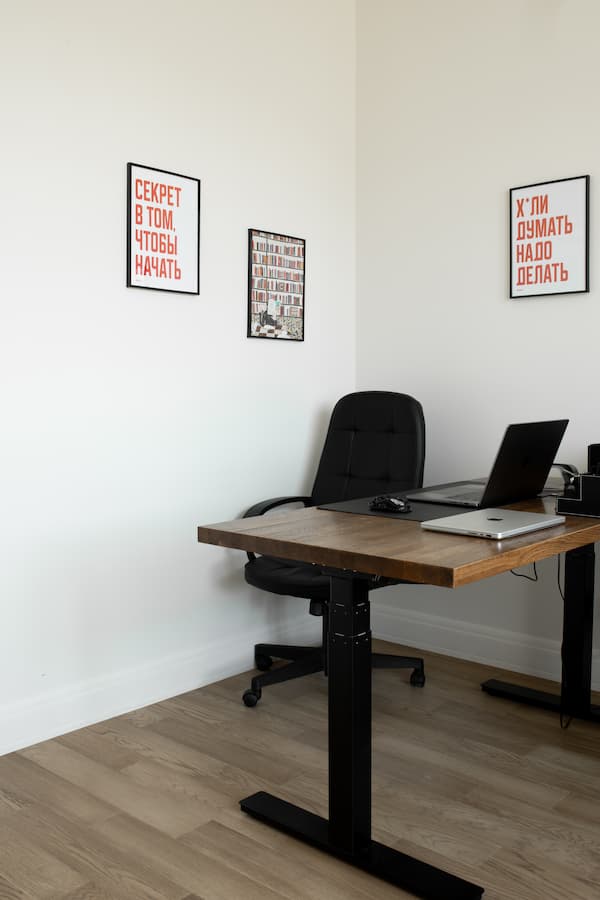 - Кабинет — строго, по делу, но со вкусом. Большой стол с регулировкой по высоте, постеры с характером и максимум дневного света.