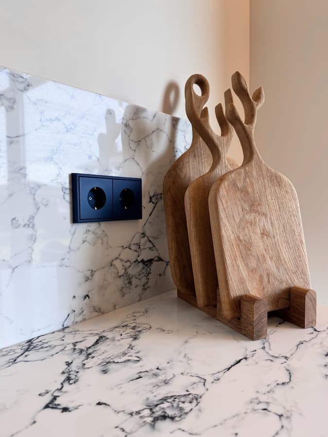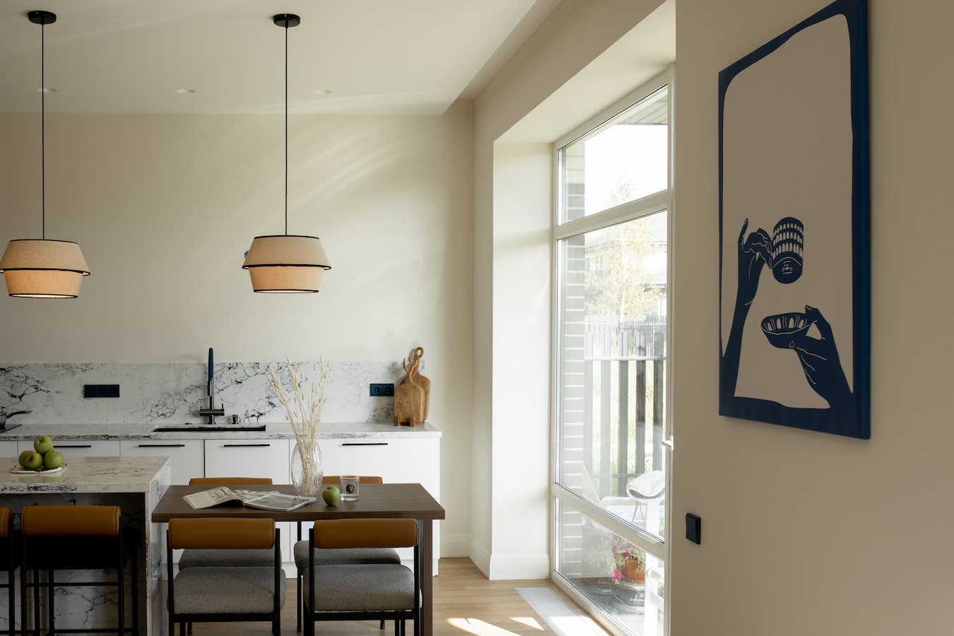 - Тактильные натуральные материалы — дерево, шпон, матовые стены, текстильные акценты, выразительный мрамор на кухонном фартуке;