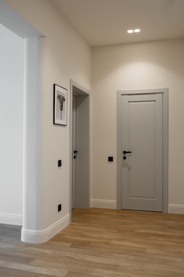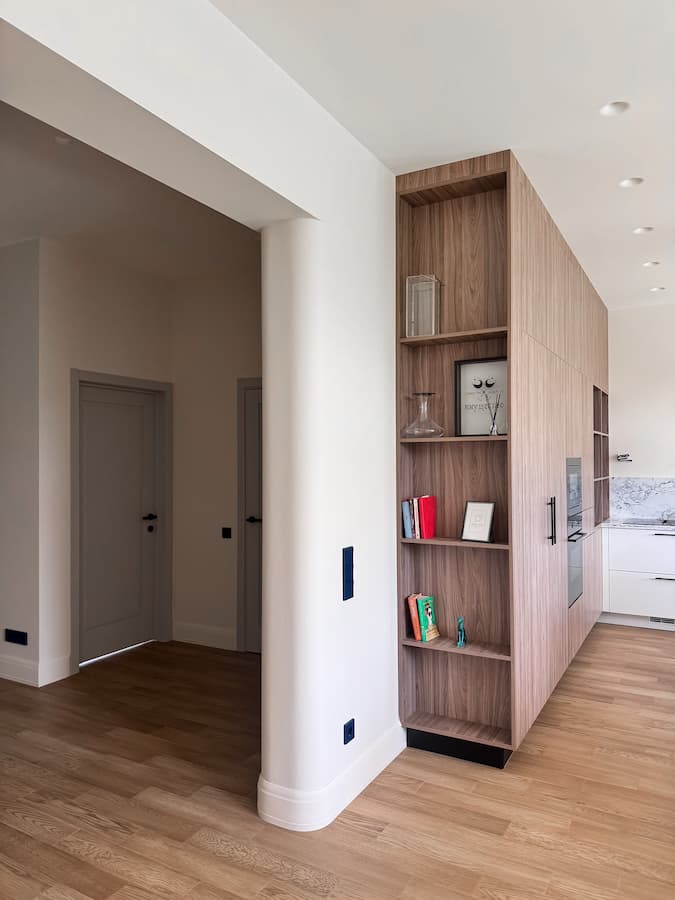 - Проработка мелочей — идеальные сопряжения, ровные плинтусы, утопленные карнизы, розетки и электрика в цвет стен.