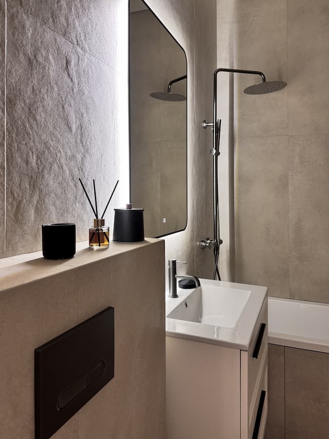 Все решения подбирались и согласовывались совместно с заказчиками — ребятами современными, практичными и с хорошим вкусом. Они точно знали, чего хотят: никаких перегрузов, визуальный покой, натуральные материалы, но при этом — смелые цветовые акценты и нестандартные приёмы. Например, закруглённые углы в архитектуре помещений и графитовая акцентная стена в детской — из тех деталей, что цепляют взгляд и добавляют характер.