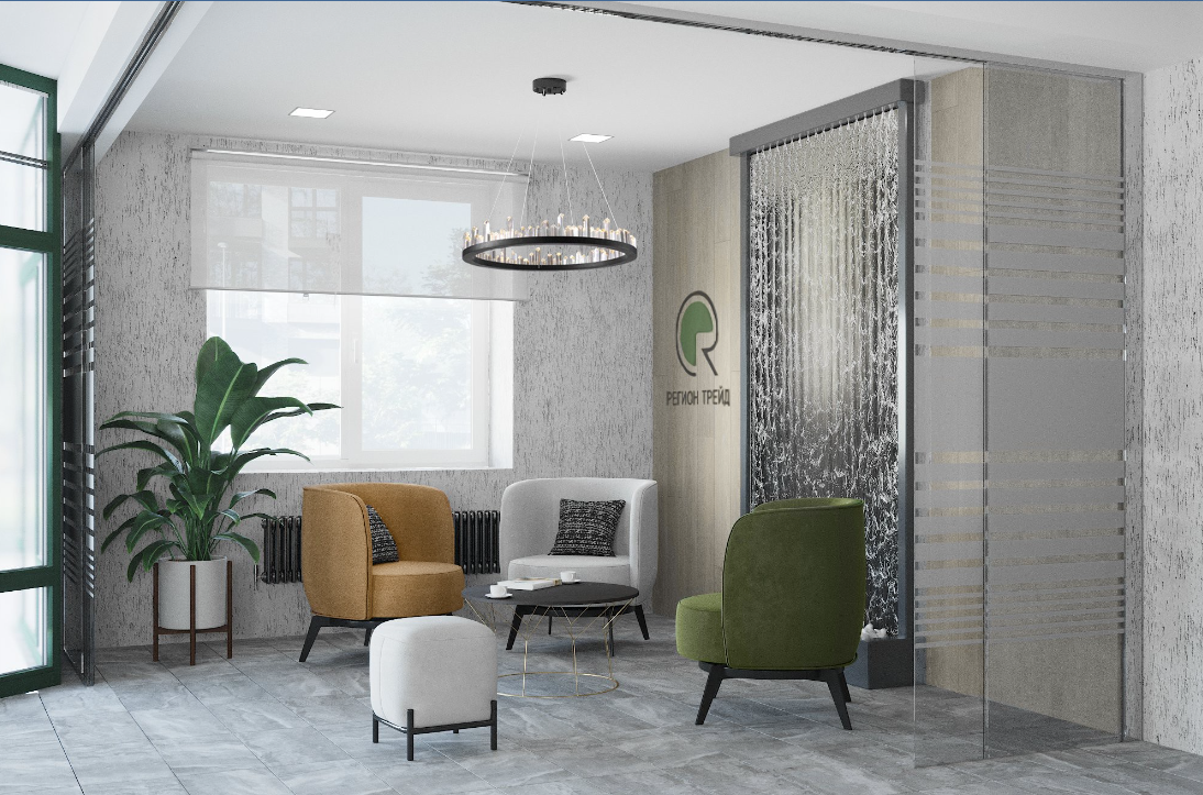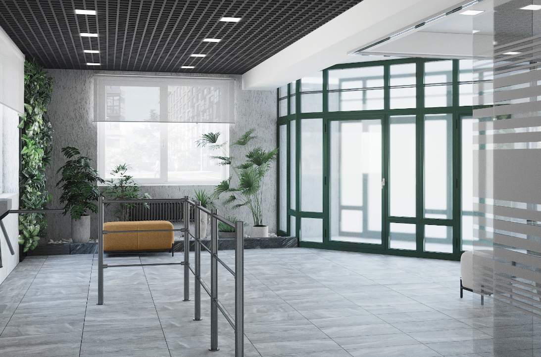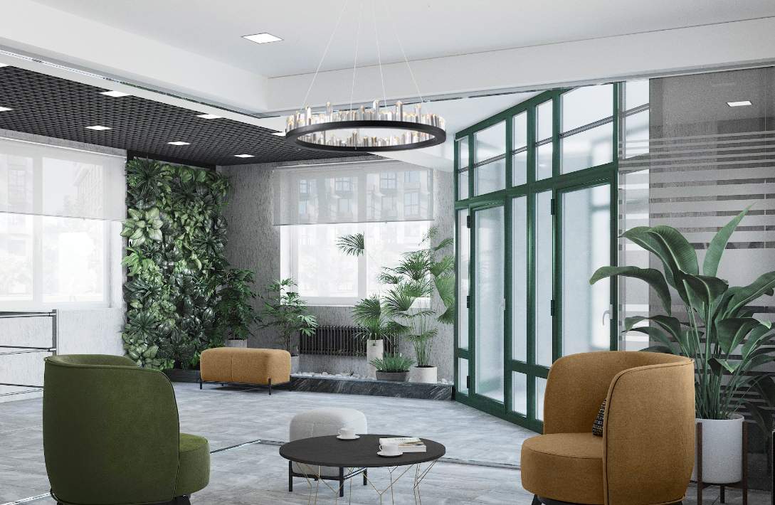 Входная зона офиса обладает уникальным дизайном интерьера, где использованы природные цвета, в основном оттенки серого и зеленый. Однако, настоящей изюминкой помещения является стена с водопадом, создающим атмосферу умиротворения и естественной красоты. Вдобавок к этому, здесь можно увидеть множество живых цветов, расположенных в разных уголках помещения, создающих яркие и живые акценты. Но настоящим украшением входной зоны стала зеленая стена, состоящая из разнообразных растений, которая придает интерьеру особый шарм и гармонию с природой. Это место не только впечатляет своей красотой, но и создает атмосферу комфорта и релаксации, встречая гостей офиса в самом начале их визита.