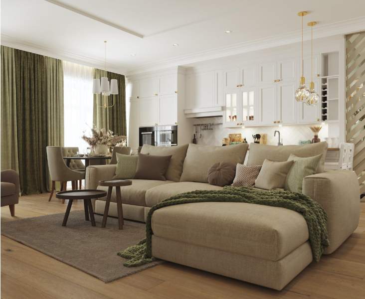 Интерьер этой трехкомнатной квартиры раскрывает в себе удивительное сочетание современности и классического стиля. Этот дом наполнен элементами английской классики, которые легко просматриваются в кухне-гостиной и спальне.