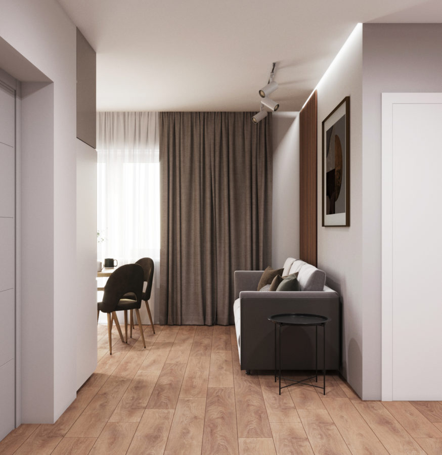Интерьер данной двухкомнатной квартиры олицетворяет идеал современного молодого человека, который стремится к комфорту и функциональности в своей жизни. В кухне-гостиной, которая является главным местом для сбора и общения с друзьями, царит атмосфера уютной и стильной обстановки.