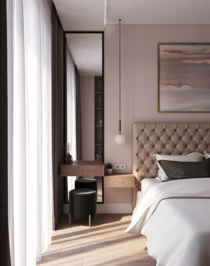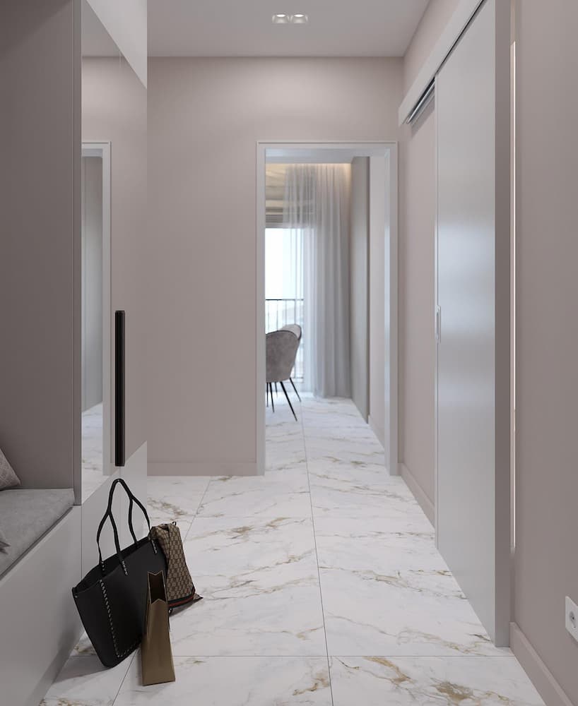 Дизайн-проект однокомнатной квартиры разработан нашим дизайнером для молодой девушки. При входе в квартиру нас встречает просторный светлый коридор. В прихожей расположен шкаф для одежды с зеркалом, что позволяет проверить свой образ перед выходом из дома.