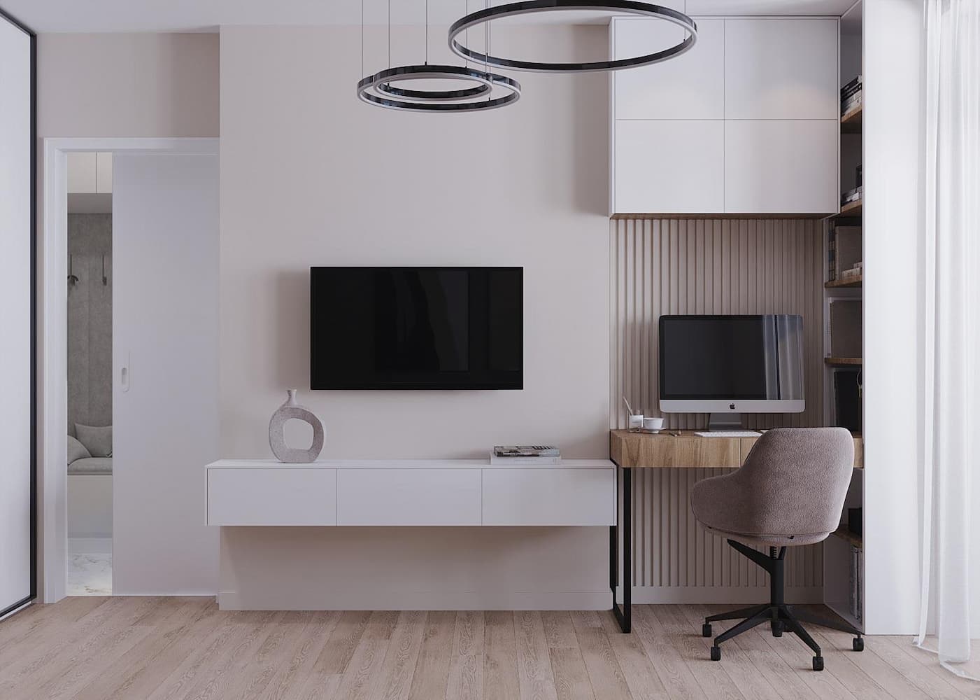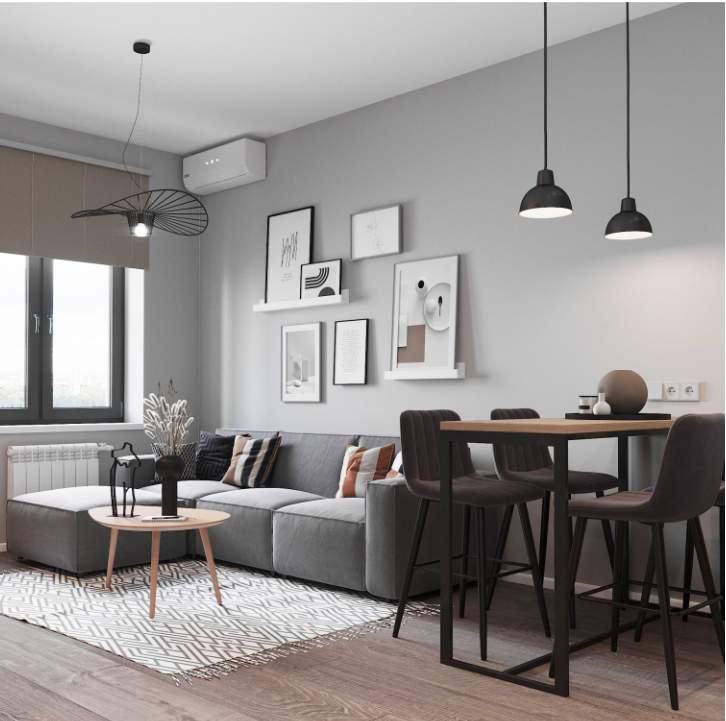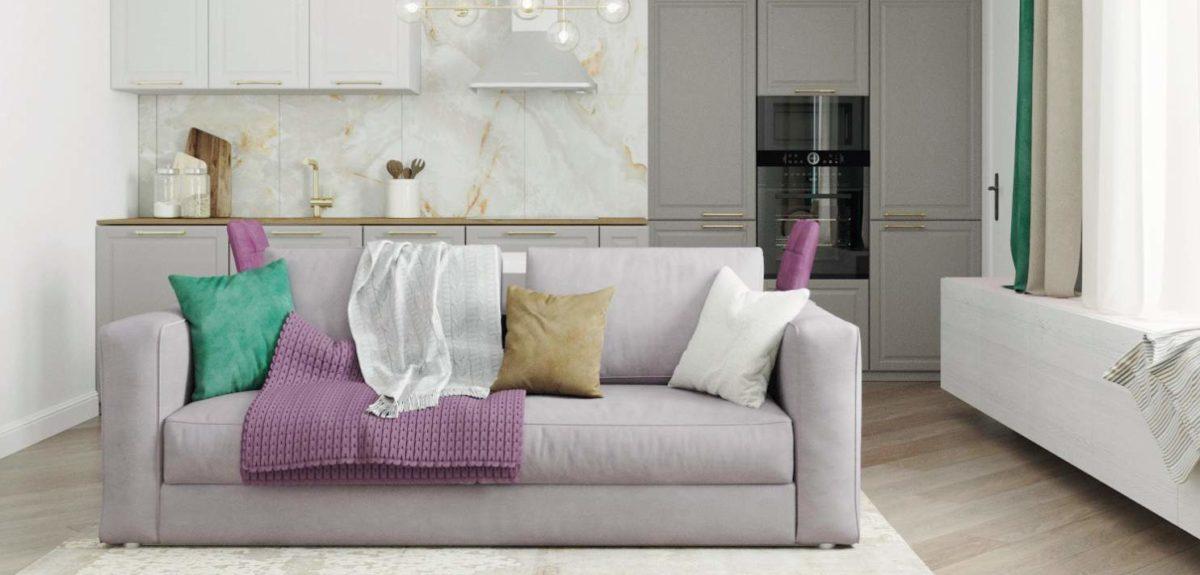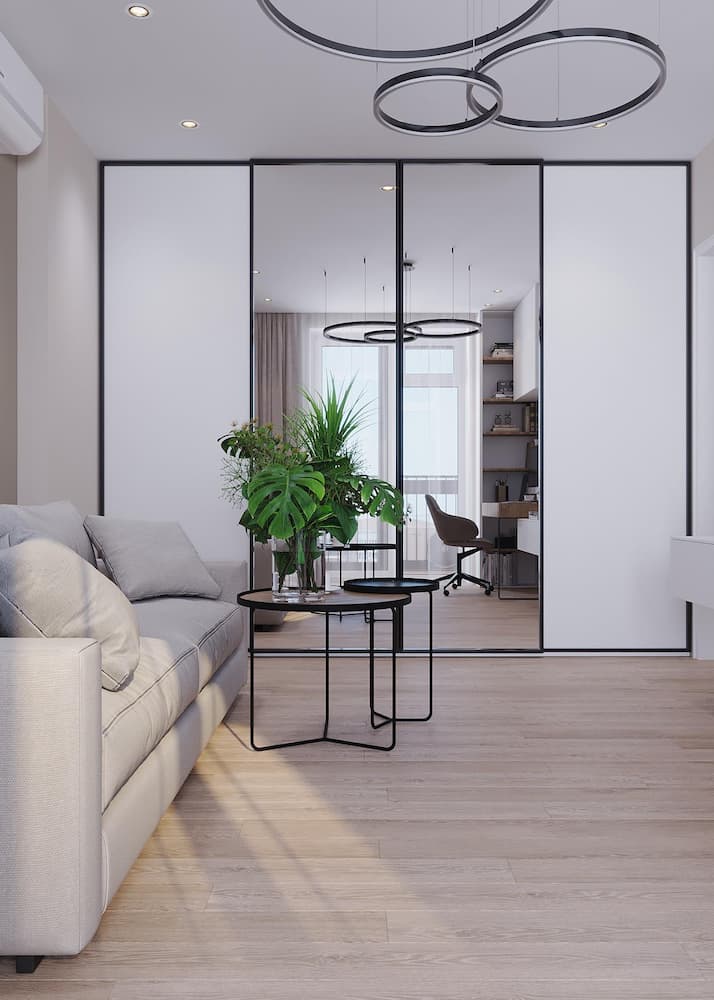 Основная комната квартиры по просьбе заказчика максимально функциональна. Здесь есть диван для отдыха и приема гостей, который также может служить основным спальным местом, помимо этого здесь расположен рабочий стол и ТВ-зона. Вместительный шкаф-купе позволяет хранить одежду и личные вещи, а зеркала на дверцах визуально расширяют пространство.