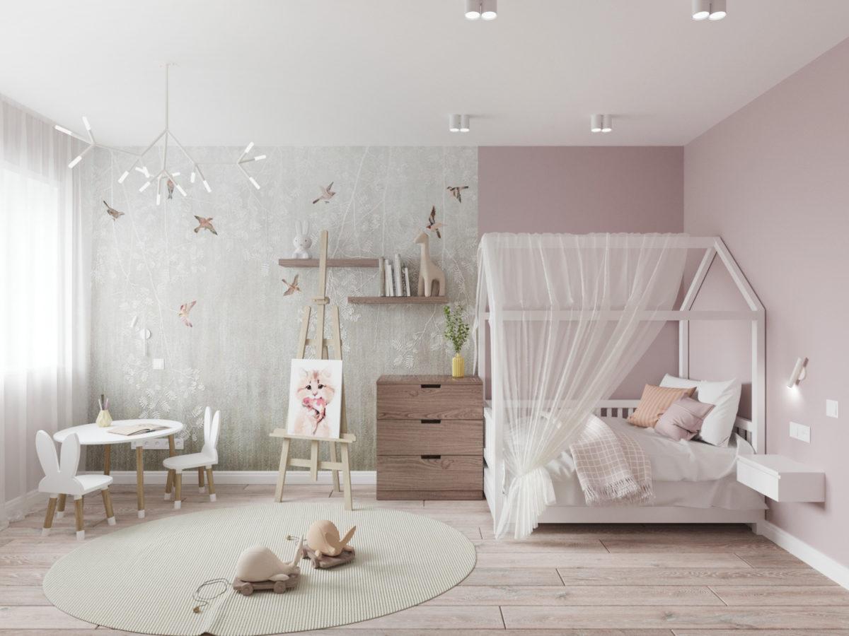 Детская комната для девочки олицетворение нежности и уюта. Интерьер выполнен в бледно-розовых и бежевых оттенках. Здесь есть место для отдыха и игр. Предусмотрены вместительные зоны для хранения вещей и игрушек.