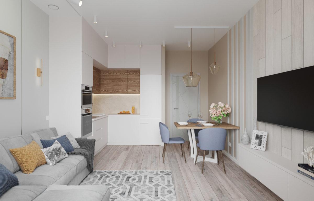 Кухня-гостиная светлое и просторное пространство. Для декора стены использовали декоративные рейки и пвх-плитку. Имеется несколько вариантов освещения. Комната многофункциональна и подойдет для приготовления и приема пищи, а также для совместного семейного отдыха и гостей.