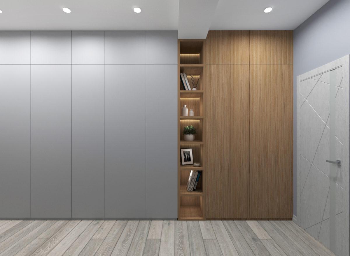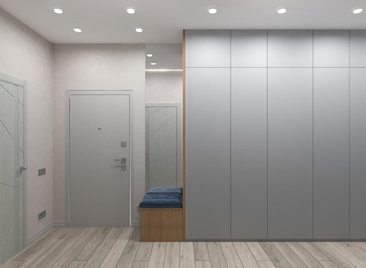 Разработан современный дизайн-проект уютной двухкомнатной квартиры. При входе в квартиру нас встречает прихожая с большим коридором и вместительным шкафом.
