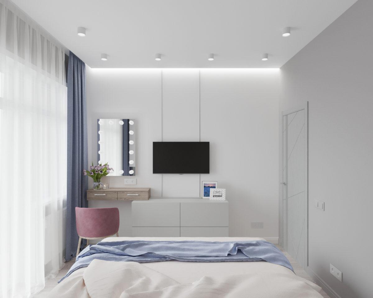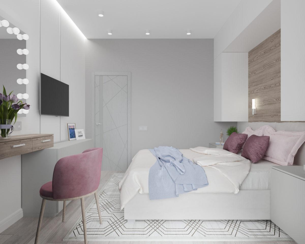 Спальная комната по желанию заказчицы выполнена светлой, практически белой. Это дает ощущение чистоты и гармонии. Цветовые акценты добавлены с помощью текстиля и декора.