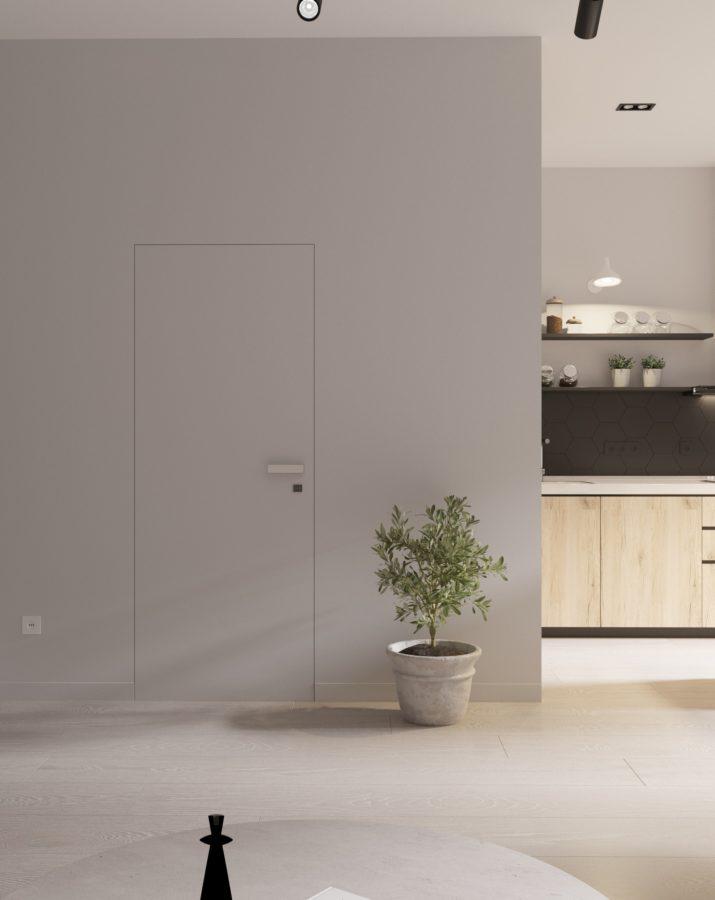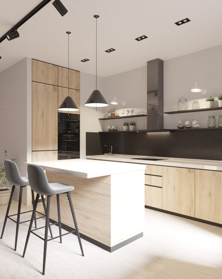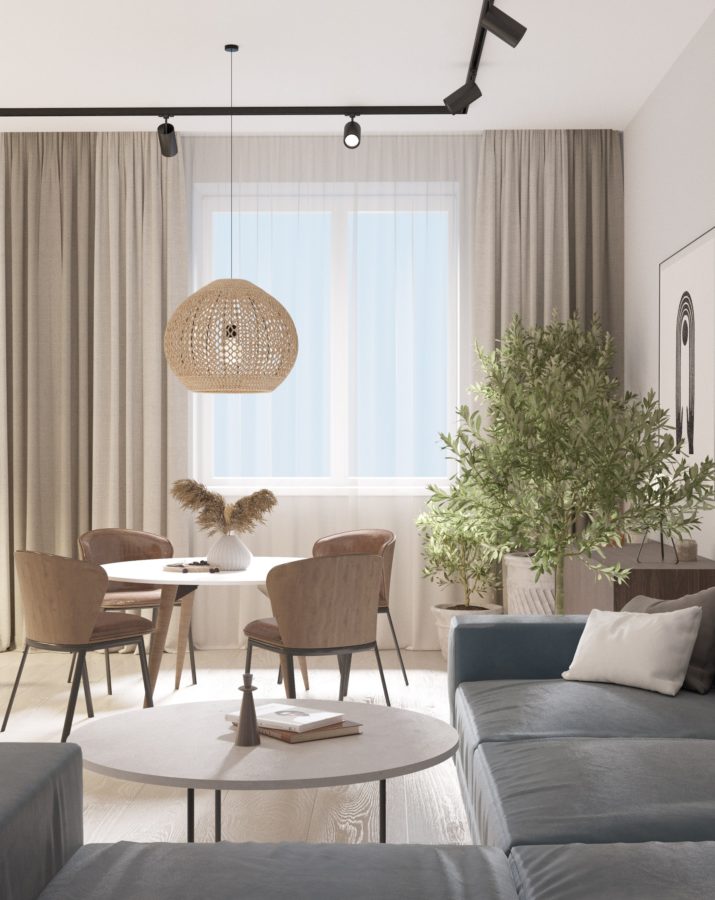 По проекту для ремонта используются только современные материалы и технологии. Дизайнерами созданы разные варианты освещения помещений. Так, например, в гостиной есть трековые светильники, люстра с плетеным абажуром над обеденной зоной, подвесные светильники над островом и бра над зоной готовки. В зависимости от потребностей, можно включать только некоторые из них. На полу кварцвиниловый ламинат — популярное сейчас покрытие, так как имеет наилучшее соотношение качества и износостойкости. Двери скрытого монтажа максимально незаметны и окрашены в цвет стен.