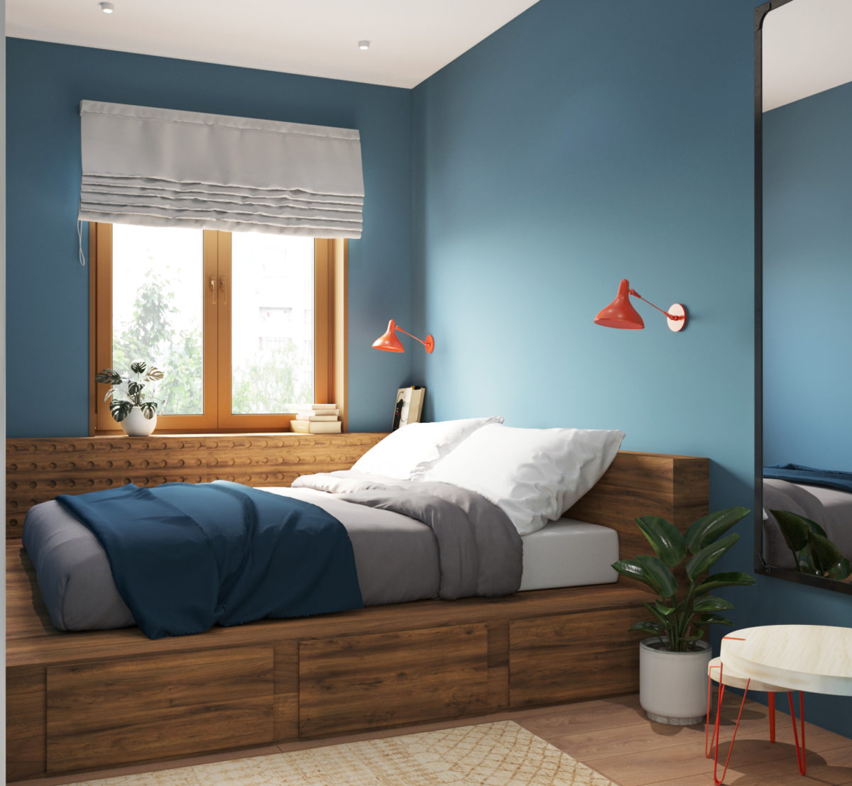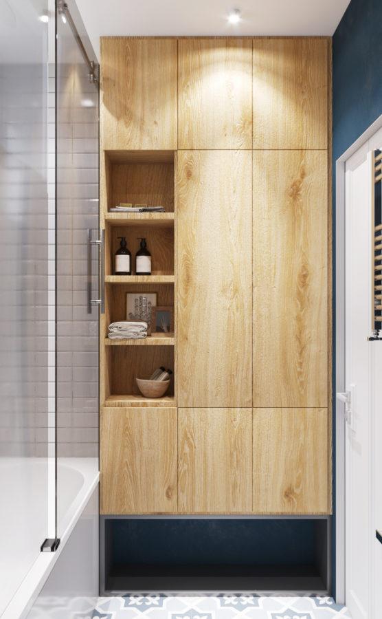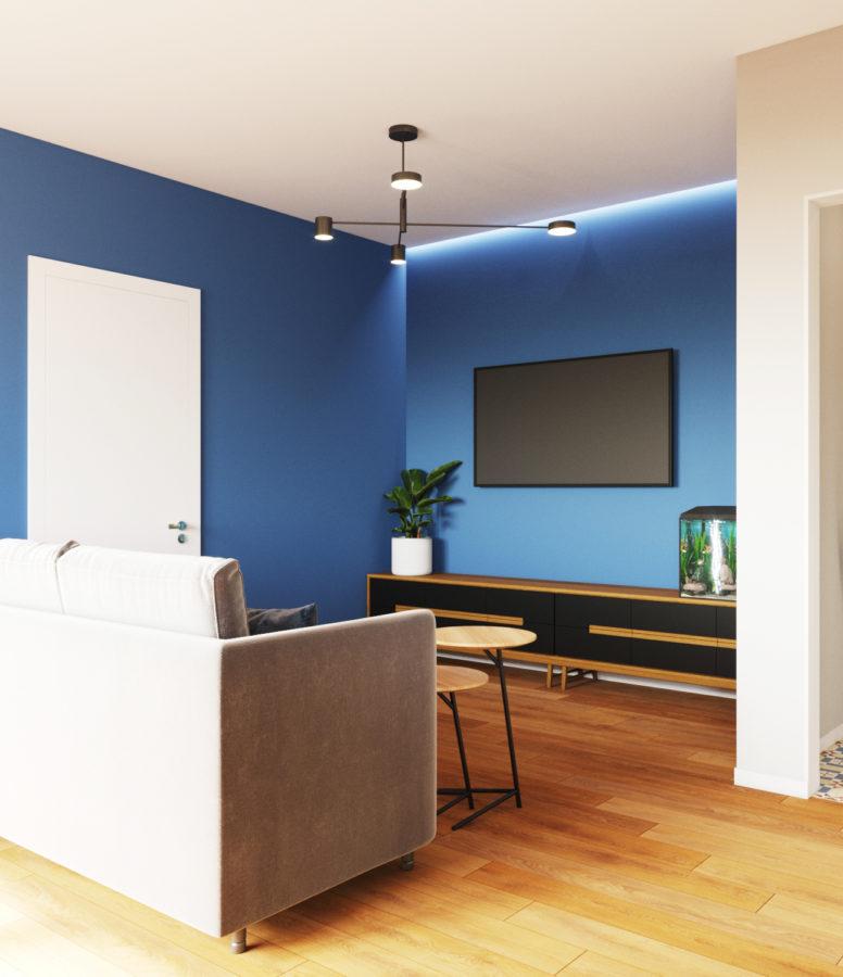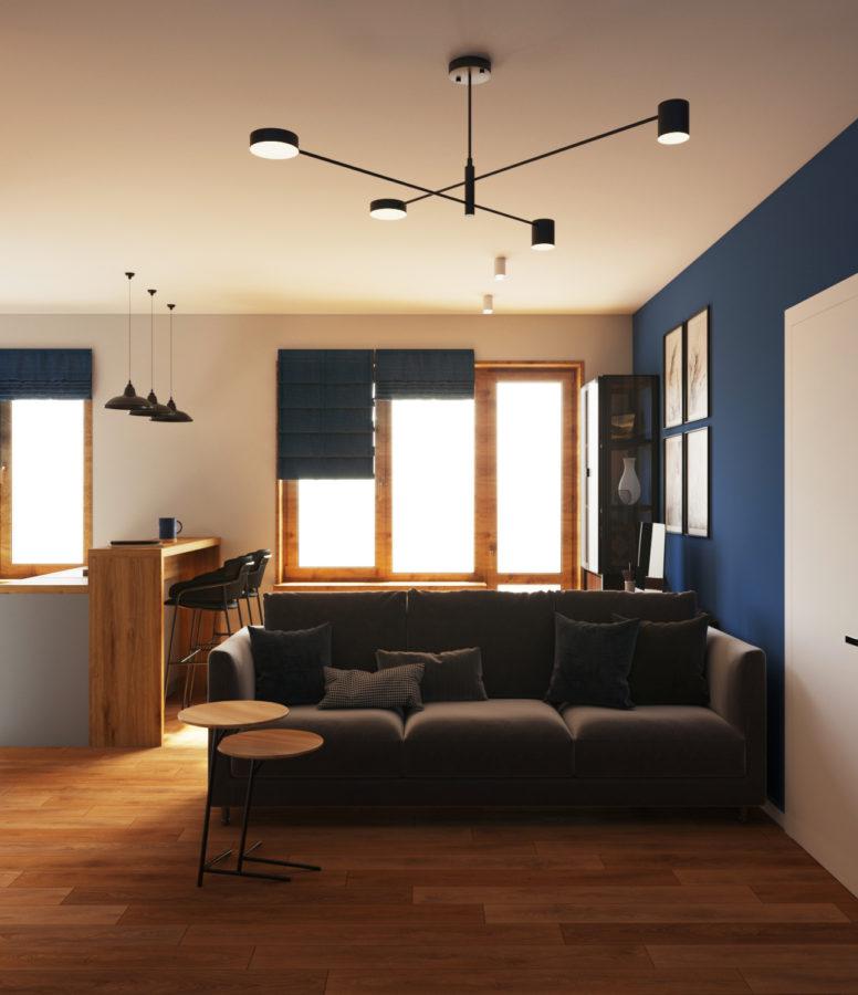 Дизайн-проект двухкомнатной студии разработан для молодого человека. Дизайн уникальный и запоминающийся. В интерьере использовано много деревянных текстур. Примечательными являются также голубые стены в гостиной и спальне. Несмотря на яркость цвета, текстуры дерева смягчают его активность и создают гармоничное сочетание.
