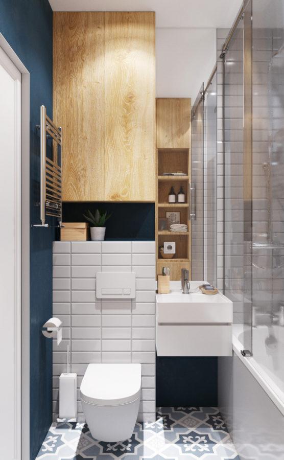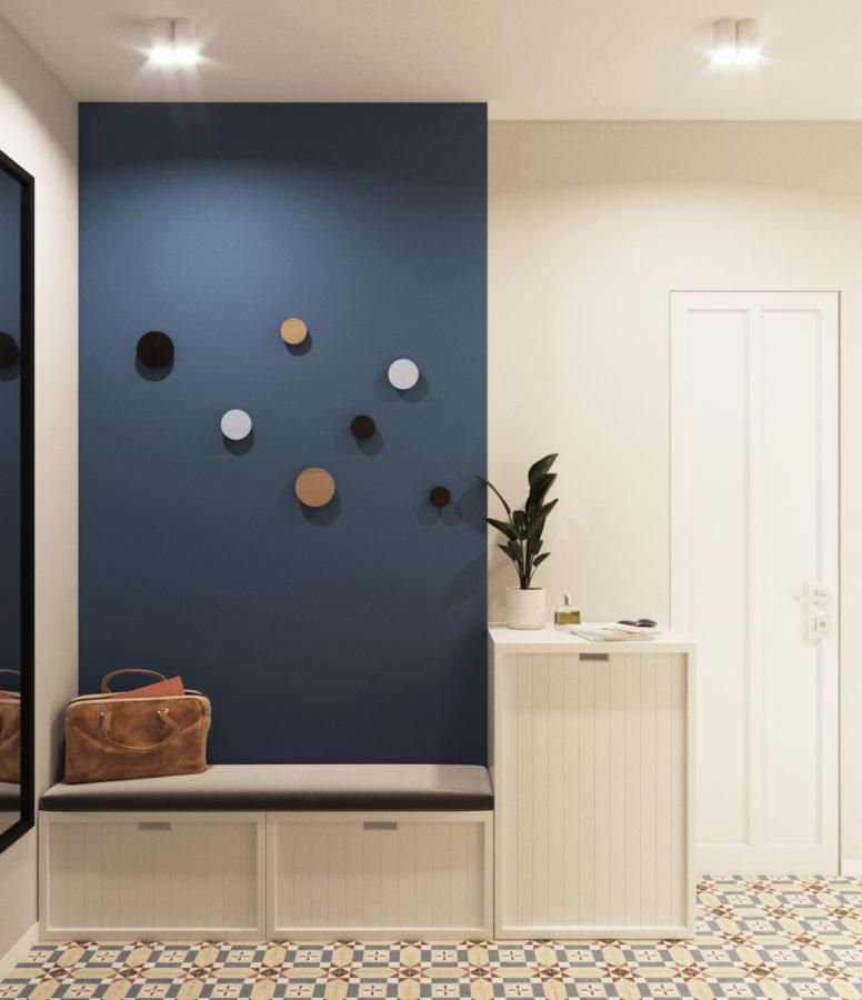 Мы всегда рекомендуем создавать дизайн-проект и проводить ремонт сразу для всей квартиры, так как это предоставляет возможность создать единый дизайн для всей квартиры и этот проект тому доказательство. Синие элементы также присутствуют в прихожей и ванной комнате. Благодаря этому все помещения выглядят стильно и гармонично.