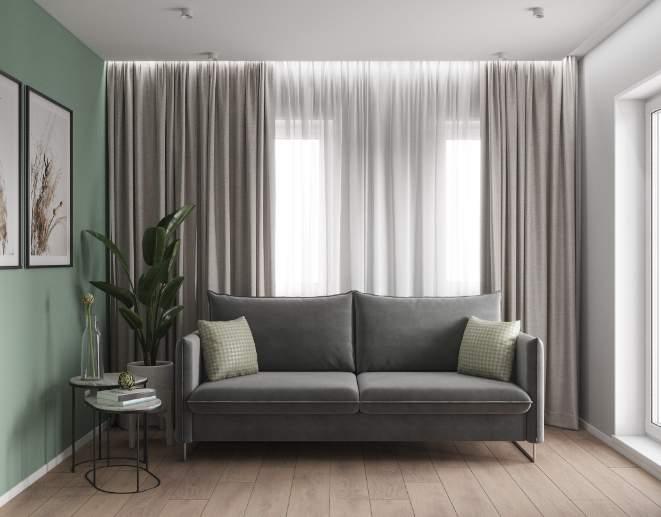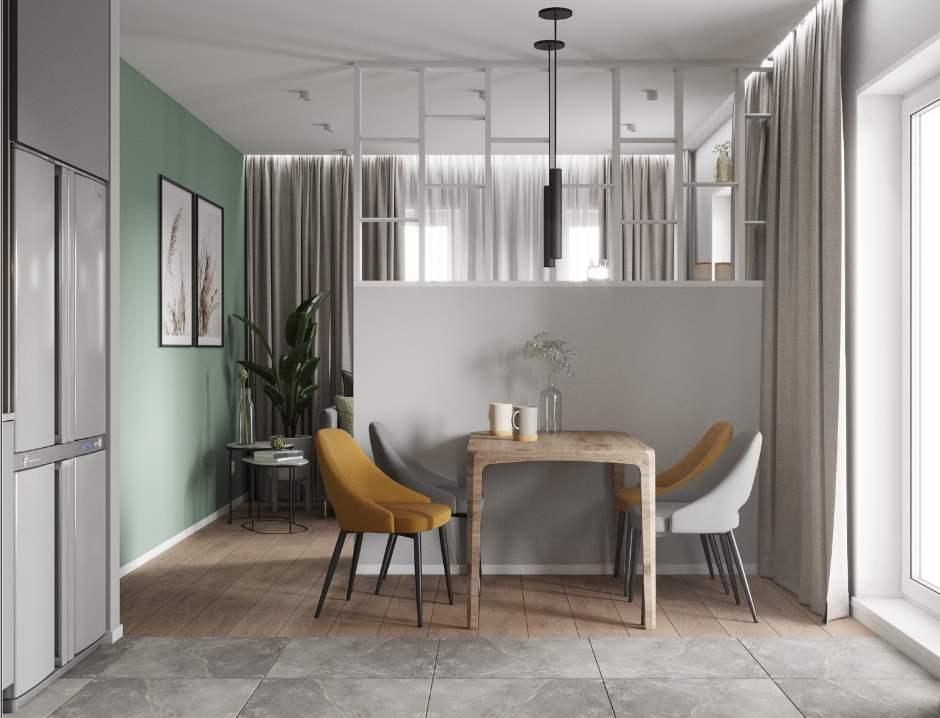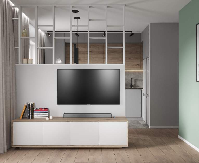 Гостиная в квартире разделена на несколько зон. Особенностью интерьера является декоративная перегородка, которая разделяет обеденную и кухонную зоны от гостиной. Кроме того, данная перегородка служит местом для размещения растений и другого декора, добавляя эстетическую и функциональную ценность пространству.