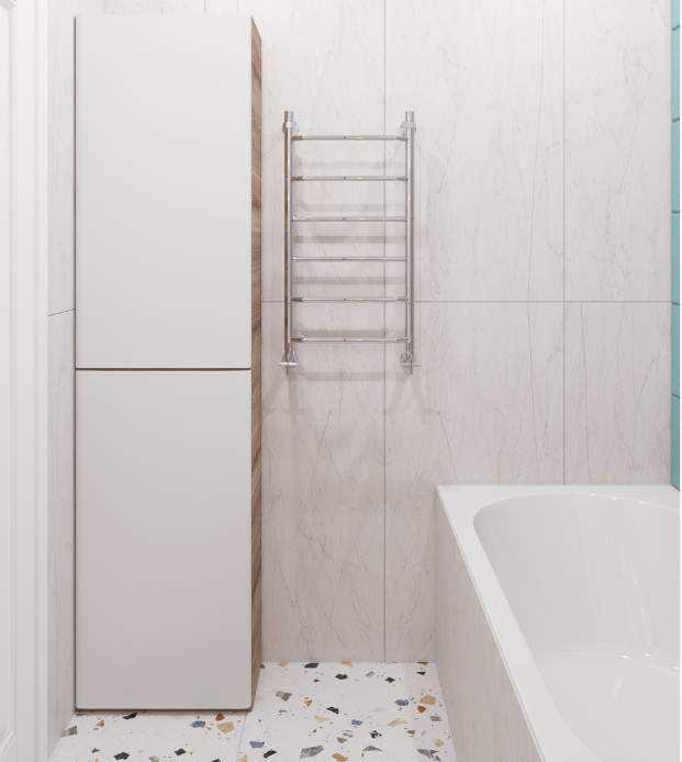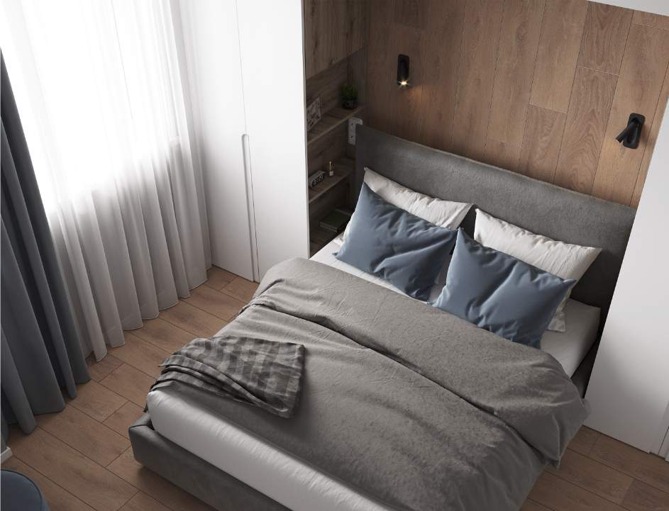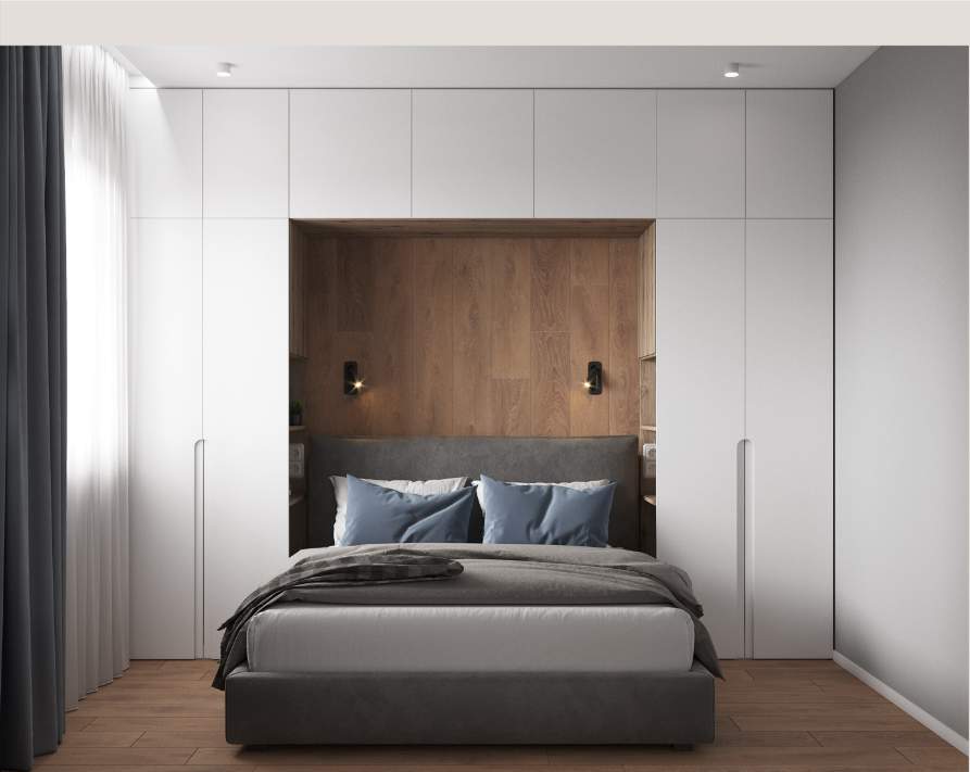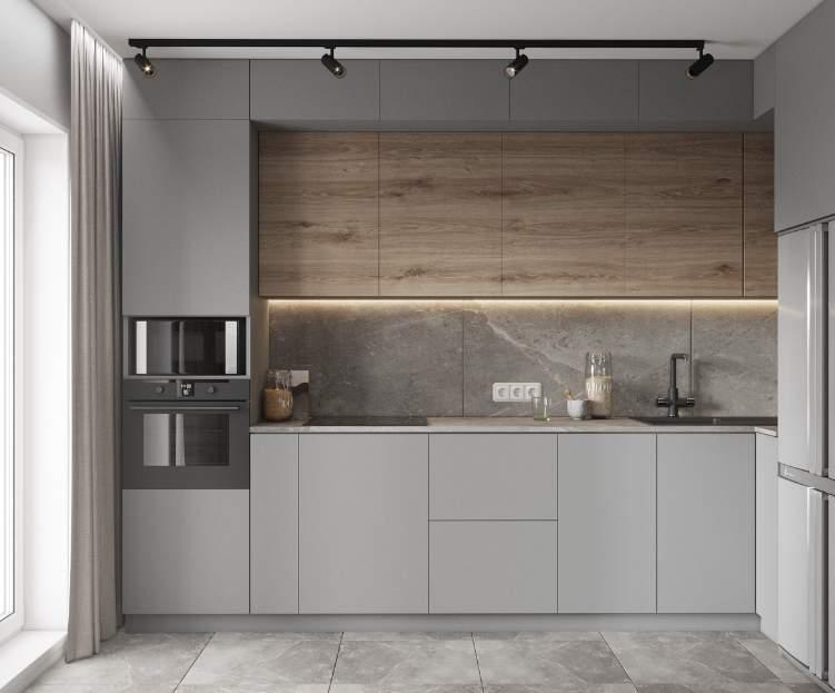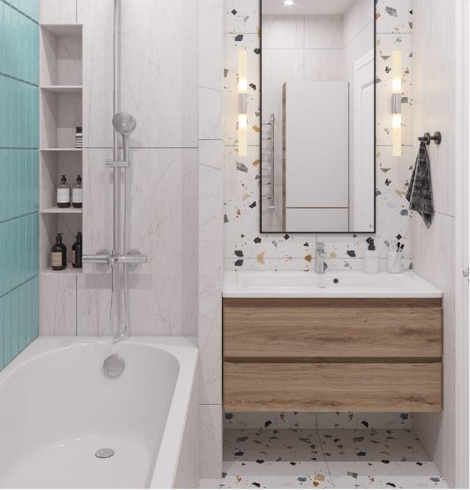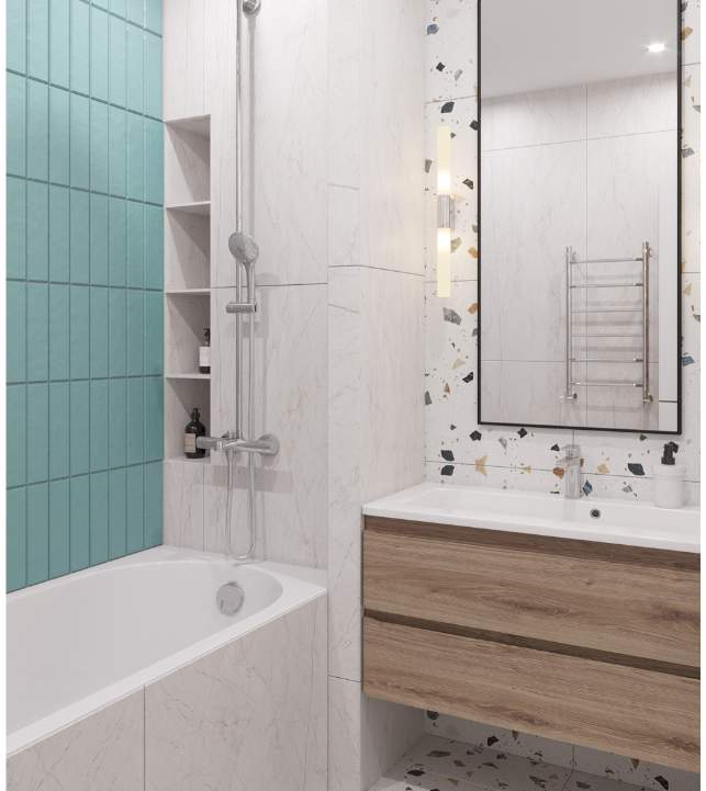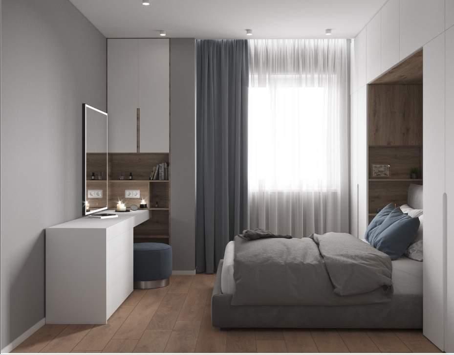 Основной цвет краски для стен – серый, однако созданы акцентные стены, добавляющие разнообразие и уникальность общей композиции. В ванной комнате и санузле для отделки стен и пола также использован керамогранит.