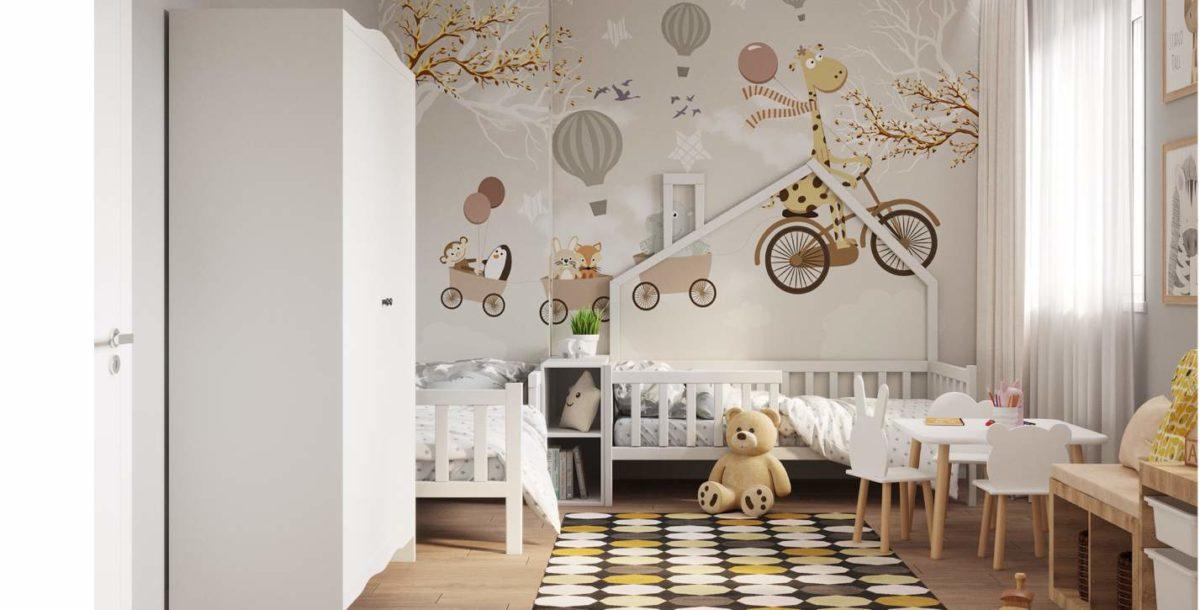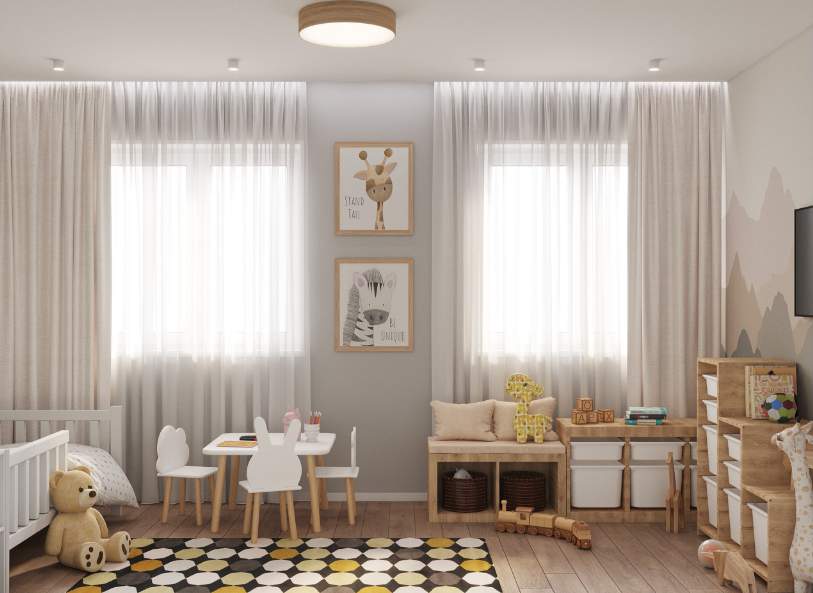 Детская комната в этой квартире спроектирована для двух маленьких детей. В ней создана игровая зона для игр и творчества, а также предусмотрено много места для хранения игрушек.