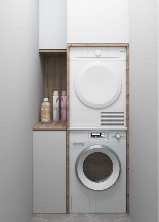 Дизайн данной квартиры выполнен в современном стиле с уникальными деталями. В качестве основного напольного покрытия для всей квартиры выбран кварцвиниловый ламинат – современное и износостойкое покрытие. Некоторые зоны с целью практичности выделены керамогранитом.