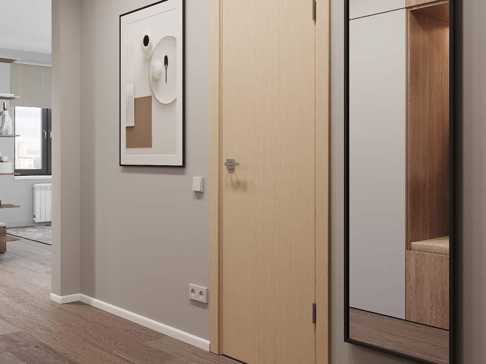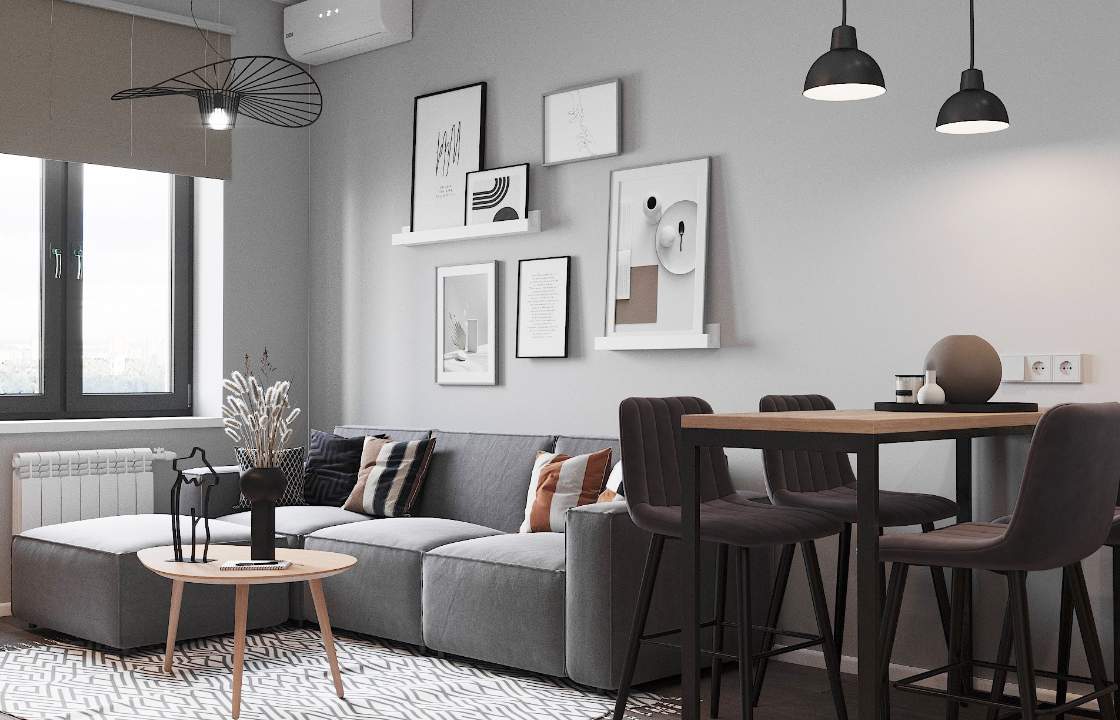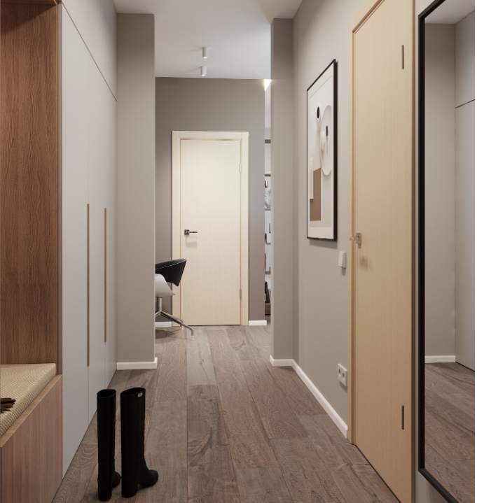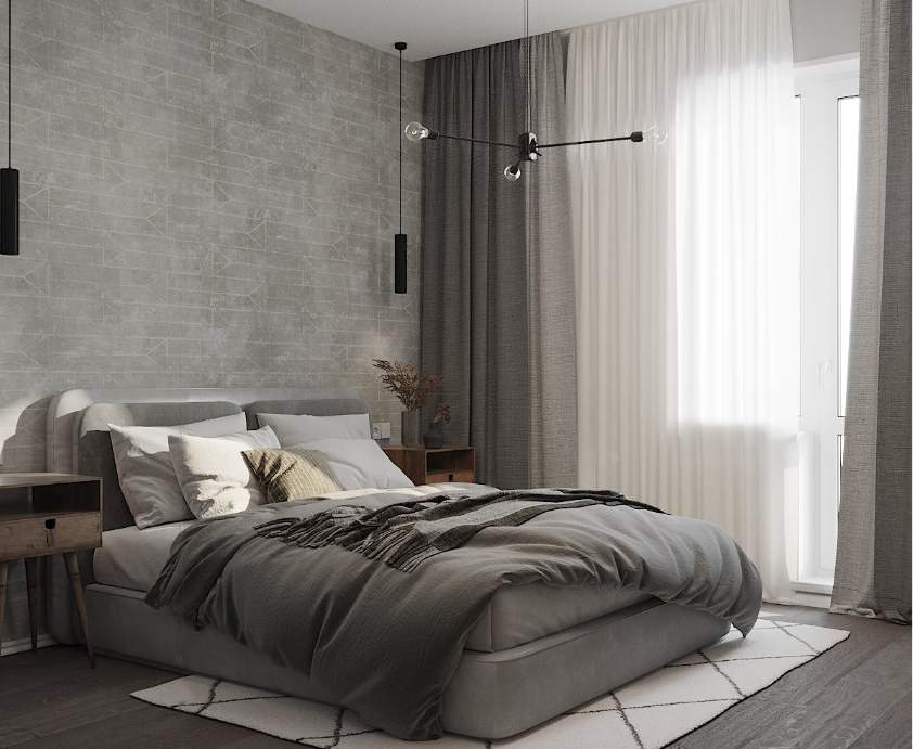 Холодный серый цвет разбавлен теплым деревянным полом и тумбами под дерево. В комнате расположены современные минималистичные светильники черного цвета.