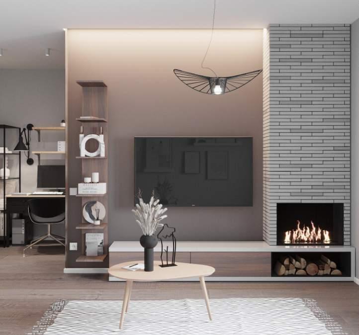 Комната небольшая, поэтому решили сделать однотонные светлые стены теплого-серого оттенка, за счет чего комната, кажется, больше и выделили ТВ-зону более темным цветом с подсветкой в разрыве потолка.