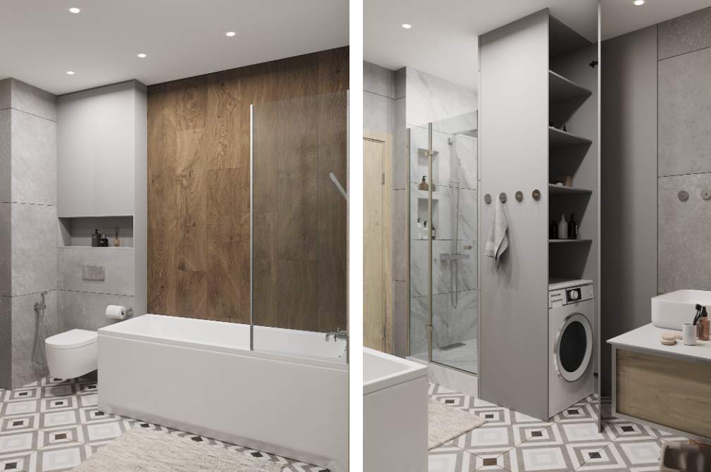Для дизайна в ванной основным фоном выбрали нейтральный светлый-серый керамогранит под камень. Шкафы под стиральную машинку, бытовую химию и шкаф над инсталляцией сделали также светлым серым фоновым цветом, чтобы пространство не казалось, что перегружено мебелью.