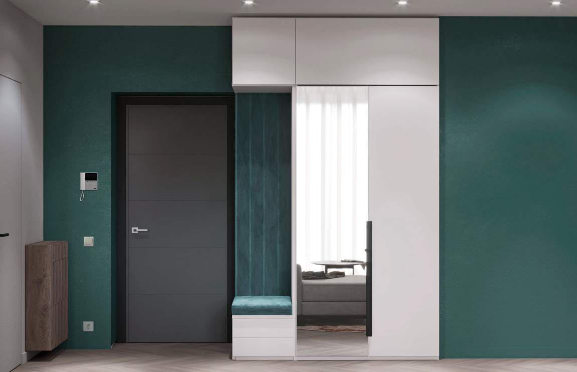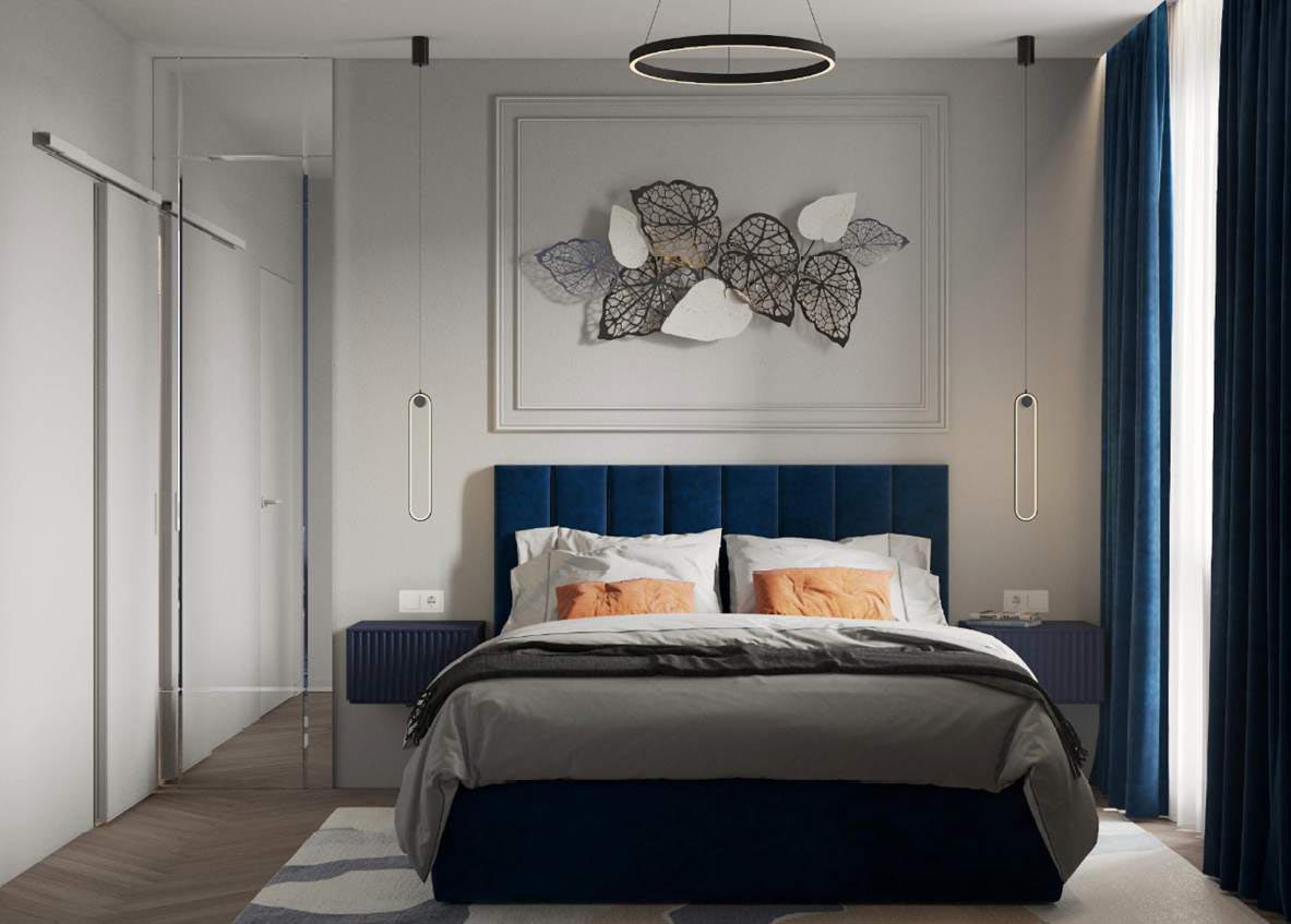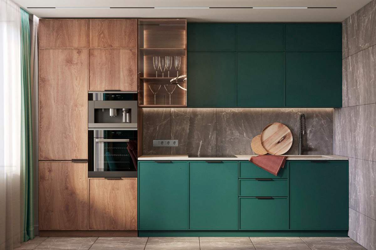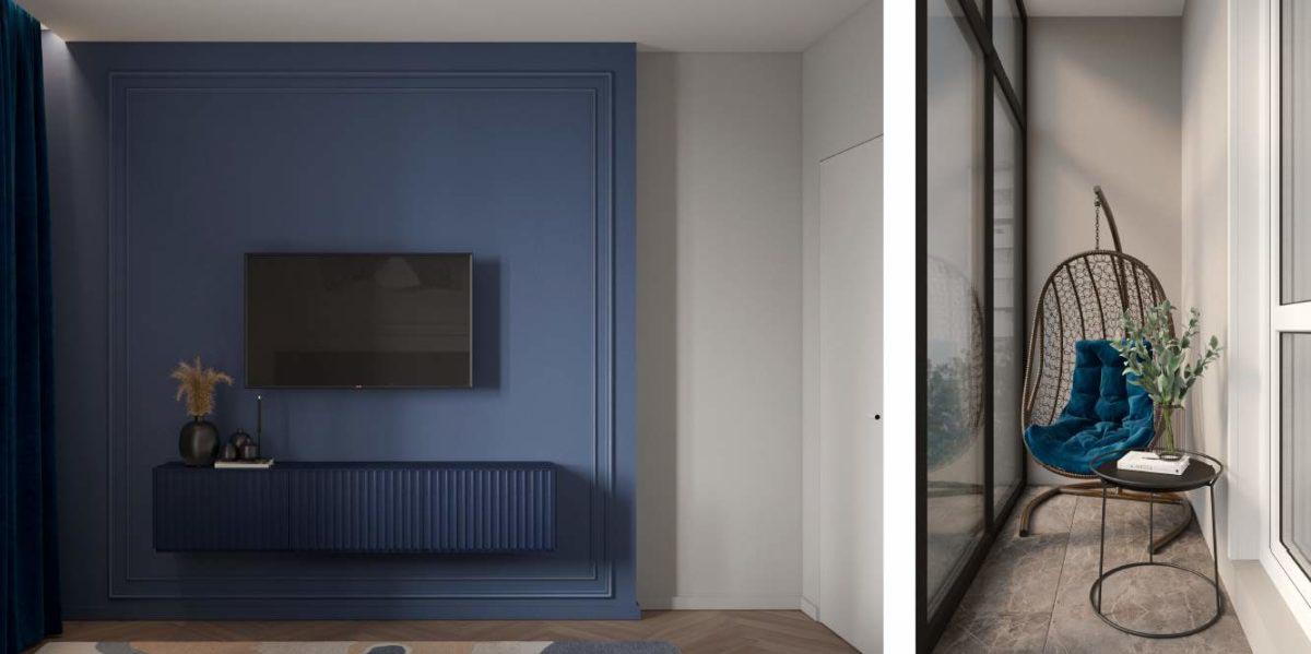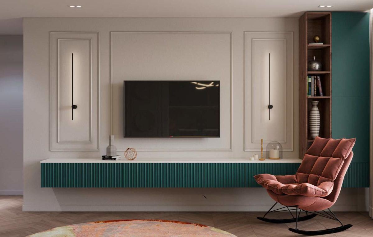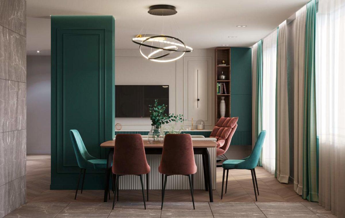 В гостиной разместился большой угловой диван, а также удобное кресло-качалка по желанию заказчиков. Они выразили пожелание о ярком зелено-изумрудном кухонном гарнитуре, поэтому одну из колонн окрасили в такой же цвет. Яркие акценты в виде насыщенного синего цвета также присутствуют в спальне. Таким образом получился стильный, современный и уютный интерьер для молодой семьи.