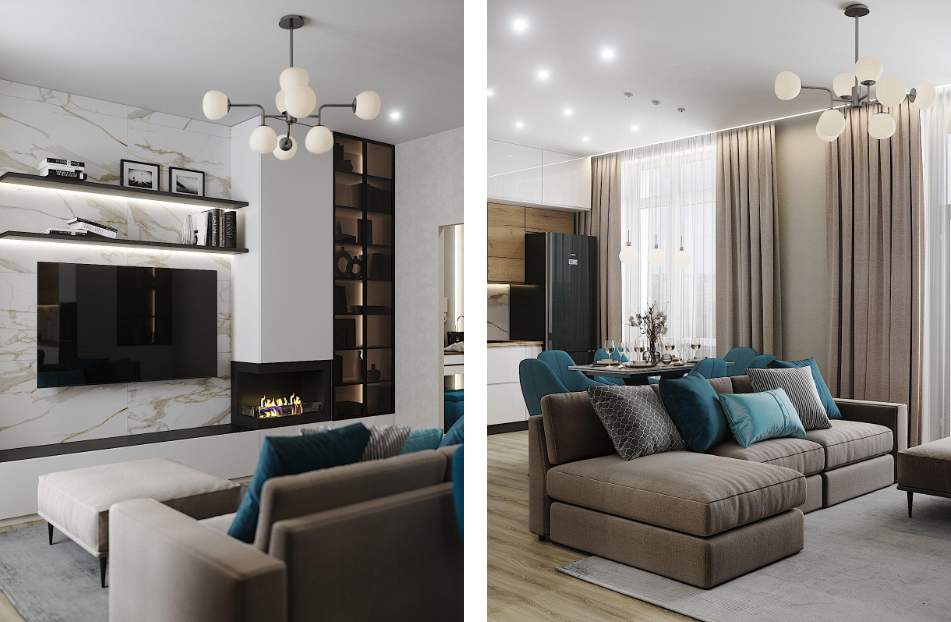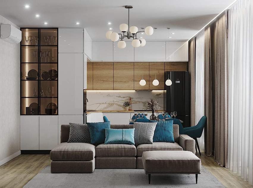 Гостиная, являющаяся центральным помещением квартиры, сразу привлекает внимание — она просторная и светлая. Большие панорамные окна позволяют проникать внутрь дневному свету. В качестве акцентного цвета выбран насыщенный бирюзовый, который отлично сочетается с основной цветовой гаммой. Кухонный гарнитур оборудован необходимой бытовой техникой.