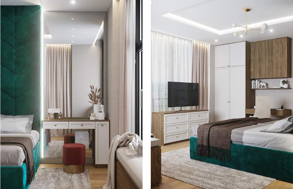 В спальне родителей царит атмосфера покоя: больашя удобная кровать с мягкими подушками, светлые шторы, защищающие от яркого света, и мягкий ковер на полу. Здесь же есть рабочее место и туалетный столик.