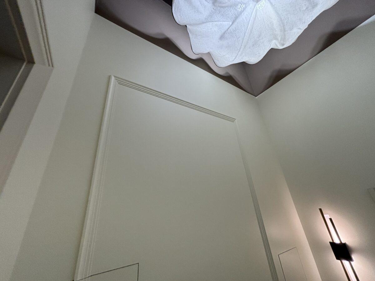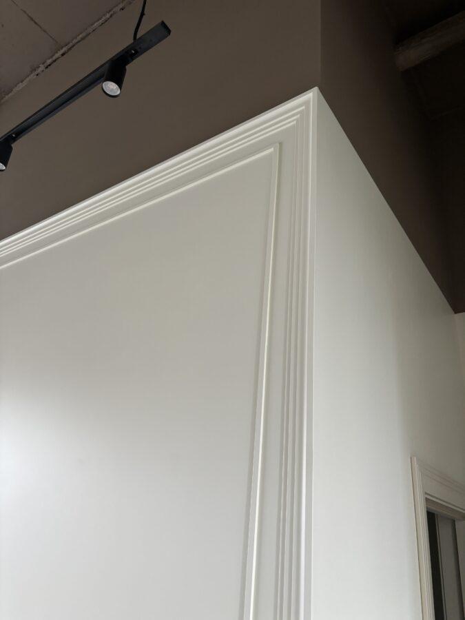 Стены окрашены в спокойные, нейтральные оттенки, идеально подходящие для демонстрации тканей и интерьерных решений. Изящные молдинги добавляют помещению элегантности, подчёркивая высокий статус салона и добавляя нотки классики.